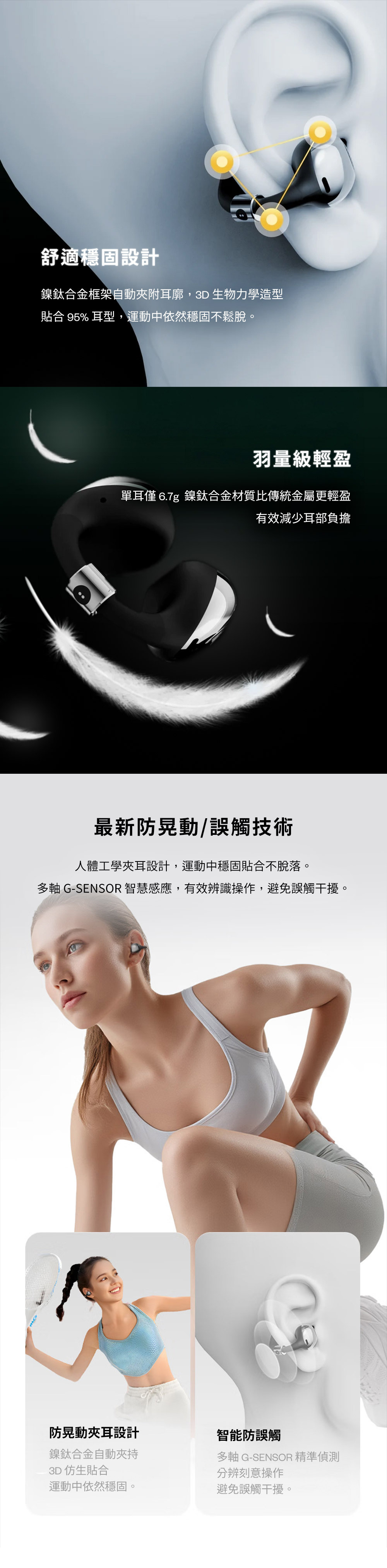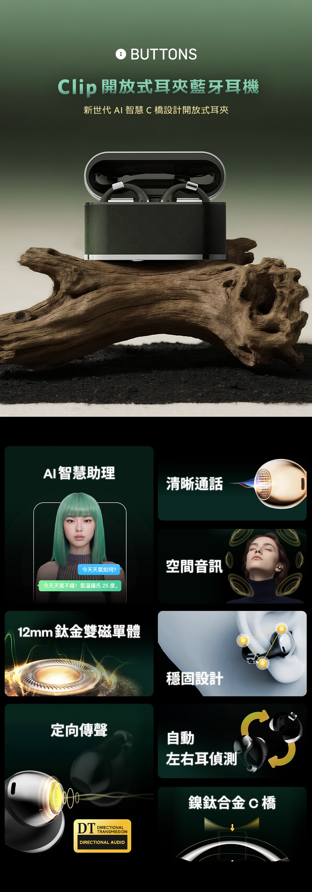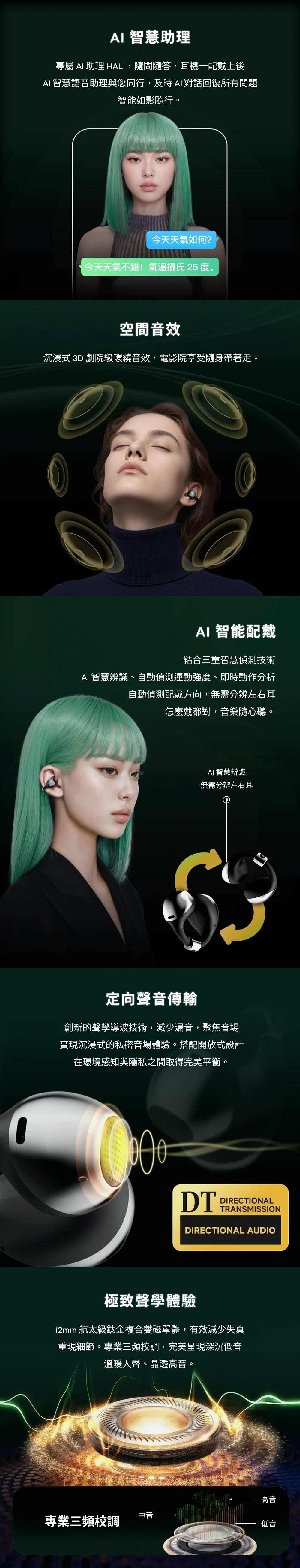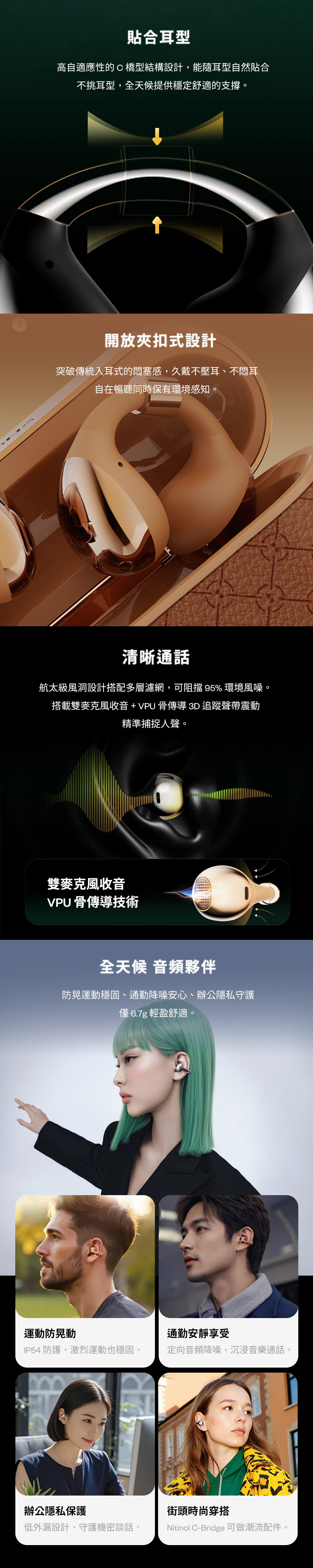 AI 助理|戴上耳機 AI智慧助理立即服務 空間音效|重現3D劇院般的環繞音效 智能配戴|自動偵測,無須分辨左右耳,無縫播放 定向傳聲|有效減少聲音外漏,聚焦音場 聽覺饗宴|專業調校,搭載12mm鈦金雙磁單體 貼合耳型|"C"橋型人體工學設計,適用各種耳形 解放雙耳|開放夾扣式設計,不悶耳超舒適 清晰通話|雙麥克風收音+VPU骨傳導技術 輕鬆掌控|防誤觸實體按鍵設計,精準便捷 穩固設計|耳夾鎖定,運動隨行更安心 配戴舒適|單耳僅6.7g,羽量級輕盈體驗 柔韌耐用|記憶合金設計,耐彎折材質 防水防塵|IP54 防護,揮汗如雨也安心暢聽 瞬間配對|藍牙5.4,超低功耗,連接更穩定 長效續航|單次電量5H,搭充電盒達15H 快速充電|快充20分鐘可提供80%電力 奢華工藝|融合航太工藝的奢華設計 個性控制|智慧 APP 客製化個人體驗
