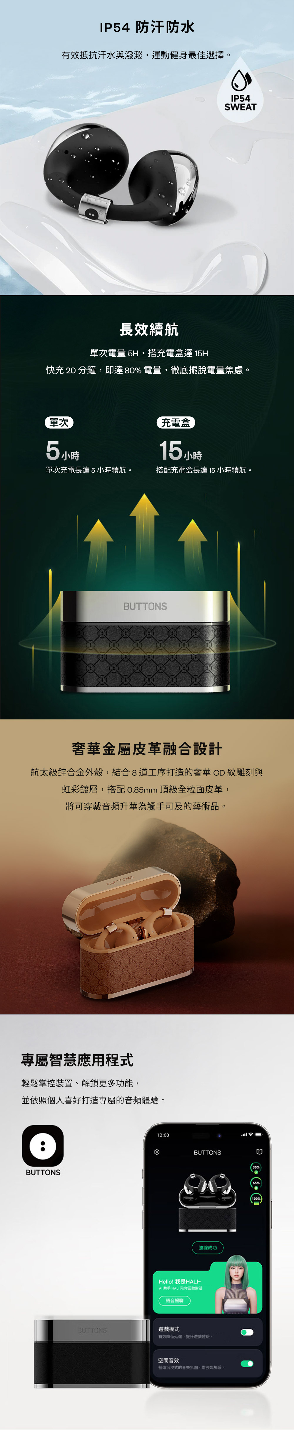AI 助理|戴上耳機 AI智慧助理立即服務 空間音效|重現3D劇院般的環繞音效 智能配戴|自動偵測,無須分辨左右耳,無縫播放 定向傳聲|有效減少聲音外漏,聚焦音場 聽覺饗宴|專業調校,搭載12mm鈦金雙磁單體 貼合耳型|"C"橋型人體工學設計,適用各種耳形 解放雙耳|開放夾扣式設計,不悶耳超舒適 清晰通話|雙麥克風收音+VPU骨傳導技術 輕鬆掌控|防誤觸實體按鍵設計,精準便捷 穩固設計|耳夾鎖定,運動隨行更安心 配戴舒適|單耳僅6.7g,羽量級輕盈體驗 柔韌耐用|記憶合金設計,耐彎折材質 防水防塵|IP54 防護,揮汗如雨也安心暢聽 瞬間配對|藍牙5.4,超低功耗,連接更穩定 長效續航|單次電量5H,搭充電盒達15H 快速充電|快充20分鐘可提供80%電力 奢華工藝|融合航太工藝的奢華設計 個性控制|智慧 APP 客製化個人體驗
