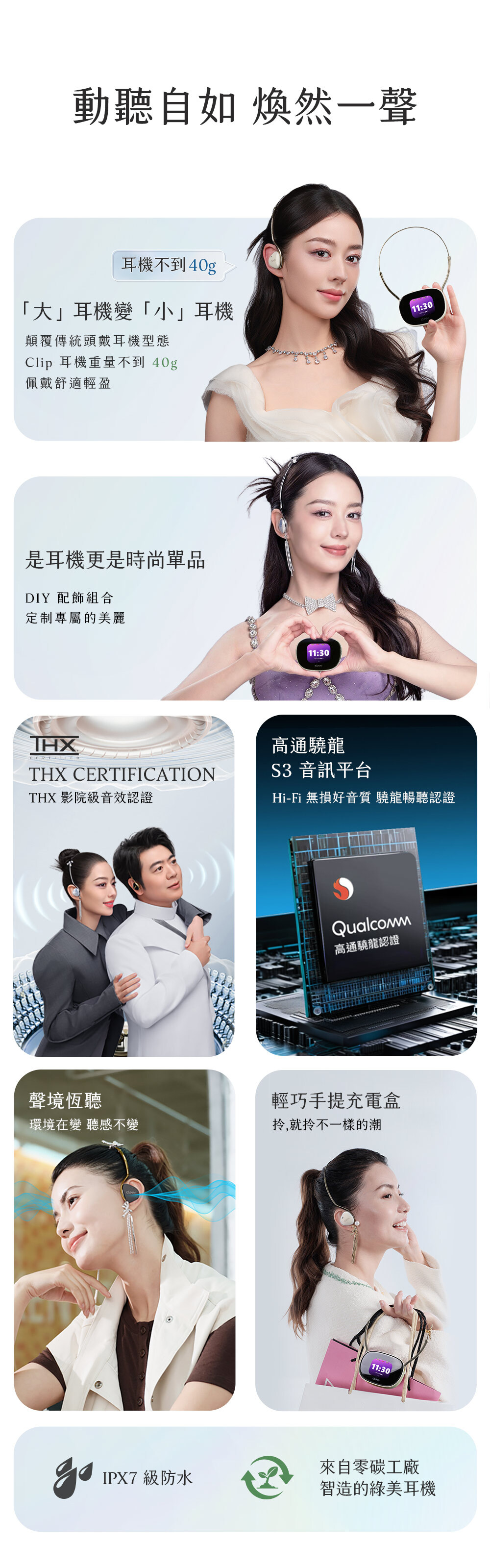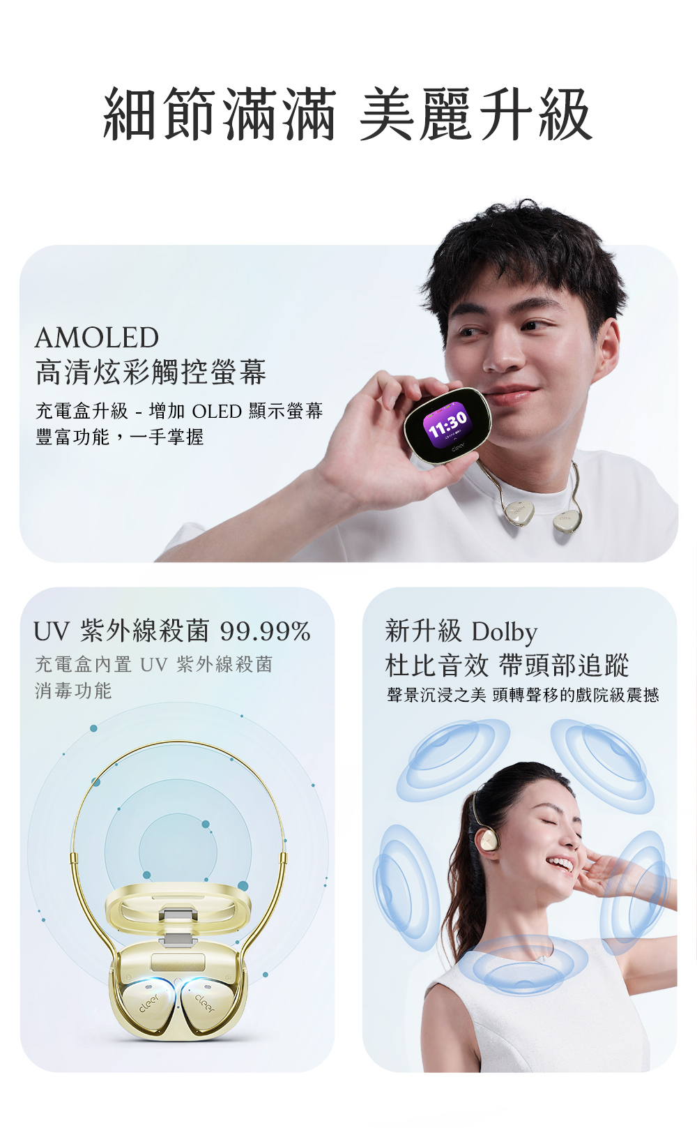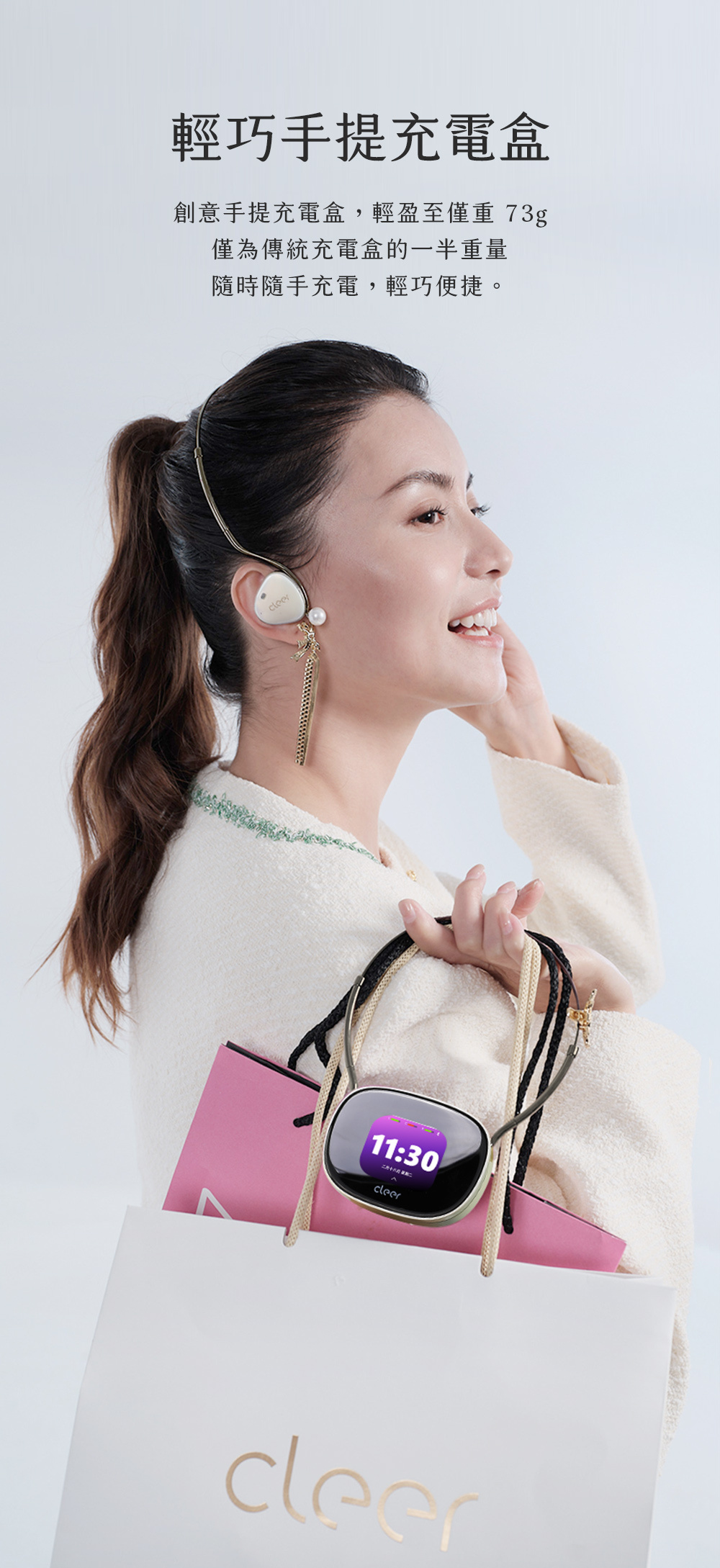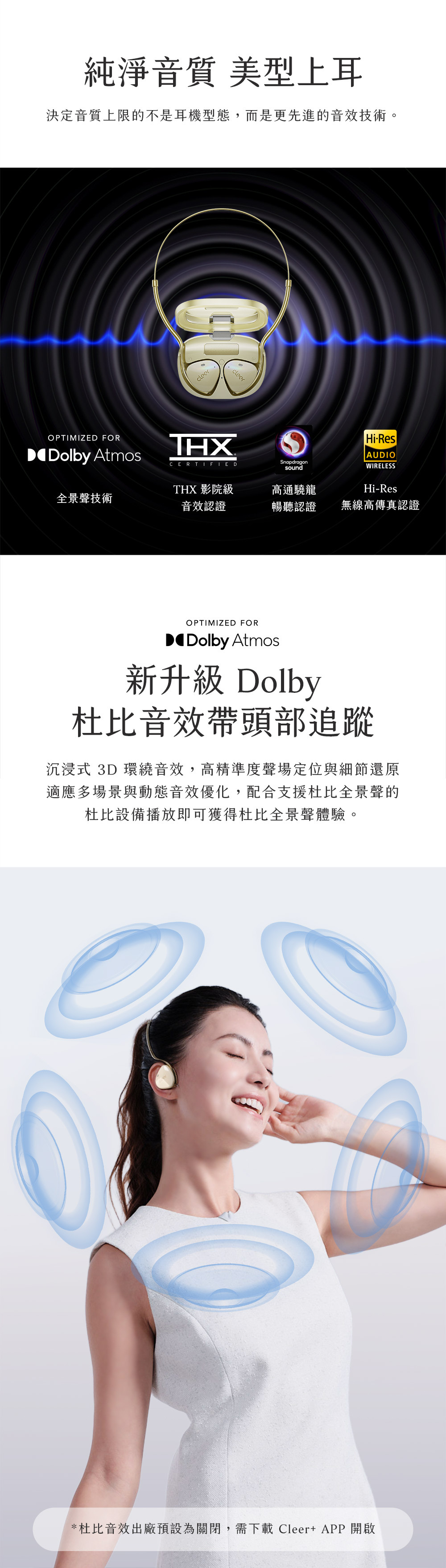 杜比全景|支持Dolby Atmos,影院級享受 專業認證|經THX認證,感受極致音效 高通晶片|高通驍龍 Snapdragon 最新音頻連線技術 震撼低音|DBE 4.0 動態低音增強功能,澎湃低音 極致音韻|通過Hi-Res Wireless音質認證 高通編碼|aptX Lossless/Adaptive 完美音質/連線/延遲 頭部追蹤|6傳感器追蹤頭部運動,360度真環繞音場 觸控螢幕|充電盒配備觸控螢幕,便於操作 殺菌消毒|充電盒內建UV紫外線消毒燈,99.9%殺菌率 附化妝鏡|充電盒內建高清化妝鏡 環境恆聽|AI恆聽讓街頭/辦公室/咖啡廳環境音感受一致 聽力保護|AI動態調整聲音大小聲,保護聽力健康 高清通話|AI場景檢測算讓戶外/騎車/高爾夫通話順暢 頂級音質|16.2mm單體,豐富細節,層次分明,震撼聽感 運動無懼|IPX7頂級防水,運動表現更升級 長效續航|28H強勁總續航 (耳機8H+充電盒20H) 衛生安全|開放設計不入耳、保護聽力,耳道衛生舒適 舒適好戴|耳掛可旋轉、伸縮、不挑耳型、配戴無感 小巧精緻|重量不到40g,厚度僅12.6mm 專屬風格|可自由搭配耳飾、髮飾,客製時尚 專屬APP|設定曲風、觸控、更新及各項智慧功能 零碳環保|通過專業認證的零碳產品,環保愛地球