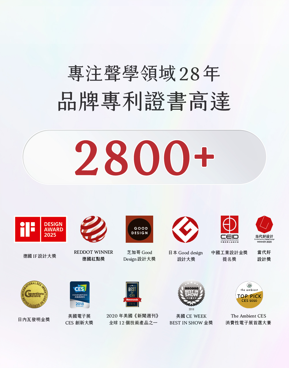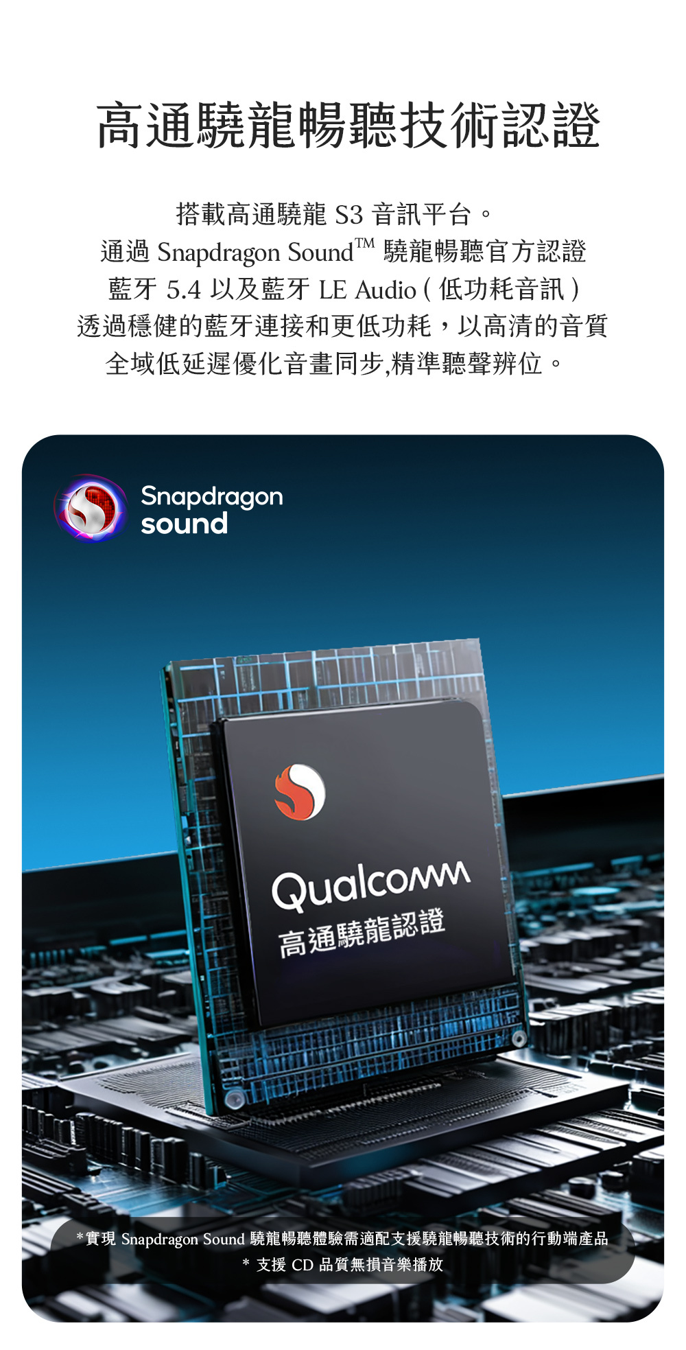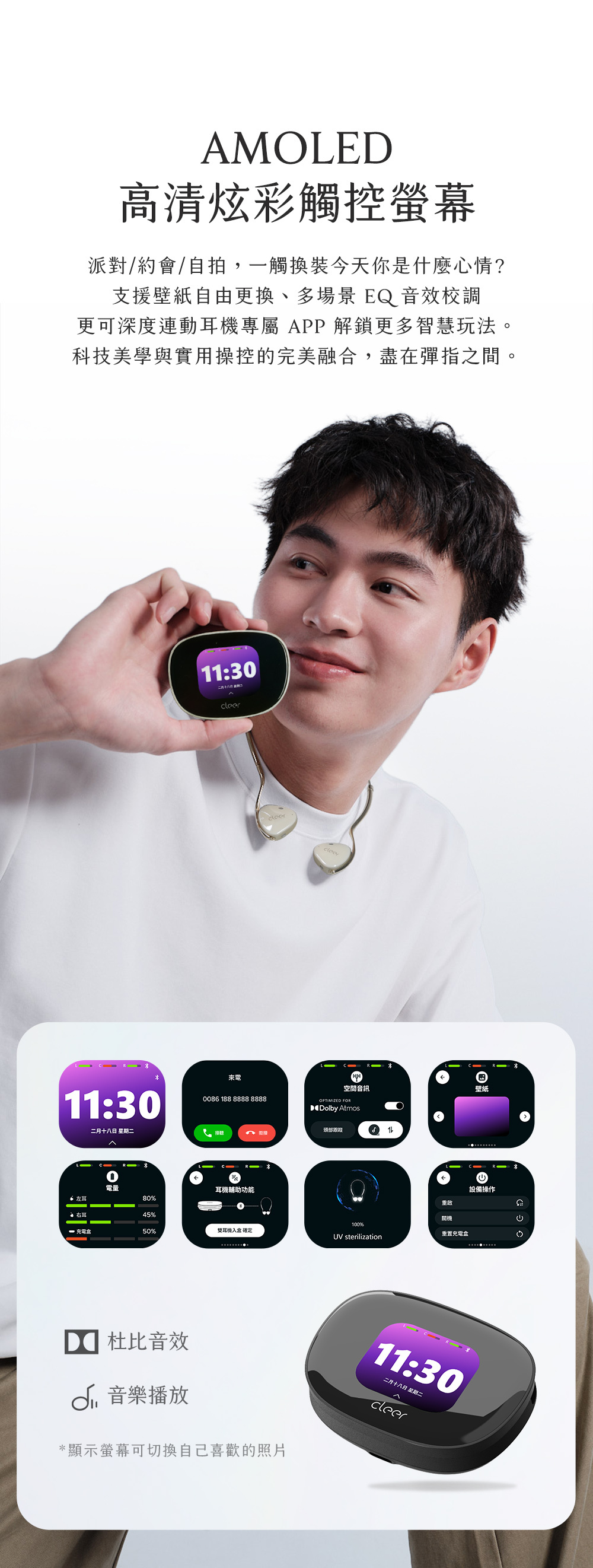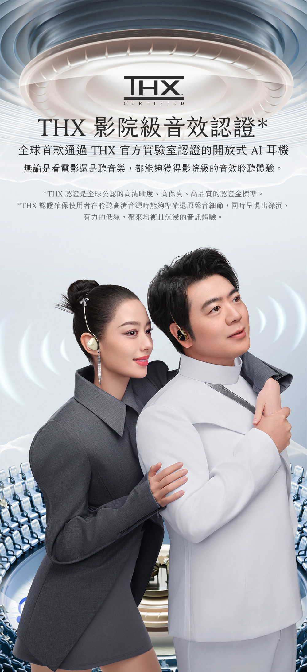 杜比全景|支持Dolby Atmos,影院級享受 專業認證|經THX認證,感受極致音效 高通晶片|高通驍龍 Snapdragon 最新音頻連線技術 震撼低音|DBE 4.0 動態低音增強功能,澎湃低音 極致音韻|通過Hi-Res Wireless音質認證 高通編碼|aptX Lossless/Adaptive 完美音質/連線/延遲 頭部追蹤|6傳感器追蹤頭部運動,360度真環繞音場 觸控螢幕|充電盒配備觸控螢幕,便於操作 殺菌消毒|充電盒內建UV紫外線消毒燈,99.9%殺菌率 附化妝鏡|充電盒內建高清化妝鏡 環境恆聽|AI恆聽讓街頭/辦公室/咖啡廳環境音感受一致 聽力保護|AI動態調整聲音大小聲,保護聽力健康 高清通話|AI場景檢測算讓戶外/騎車/高爾夫通話順暢 頂級音質|16.2mm單體,豐富細節,層次分明,震撼聽感 運動無懼|IPX7頂級防水,運動表現更升級 長效續航|28H強勁總續航 (耳機8H+充電盒20H) 衛生安全|開放設計不入耳、保護聽力,耳道衛生舒適 舒適好戴|耳掛可旋轉、伸縮、不挑耳型、配戴無感 小巧精緻|重量不到40g,厚度僅12.6mm 專屬風格|可自由搭配耳飾、髮飾,客製時尚 專屬APP|設定曲風、觸控、更新及各項智慧功能 零碳環保|通過專業認證的零碳產品,環保愛地球