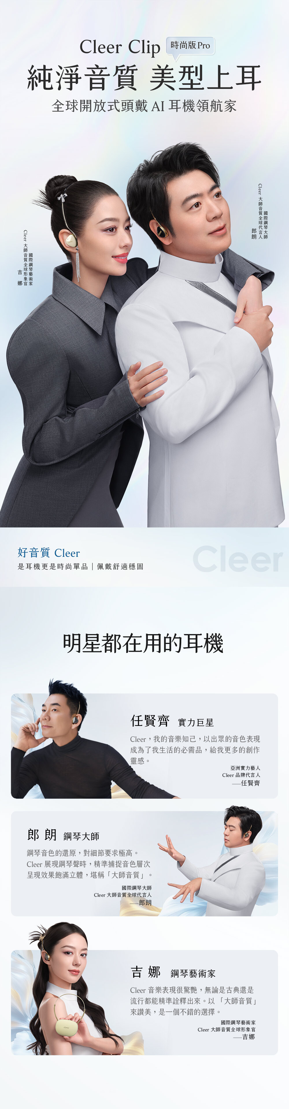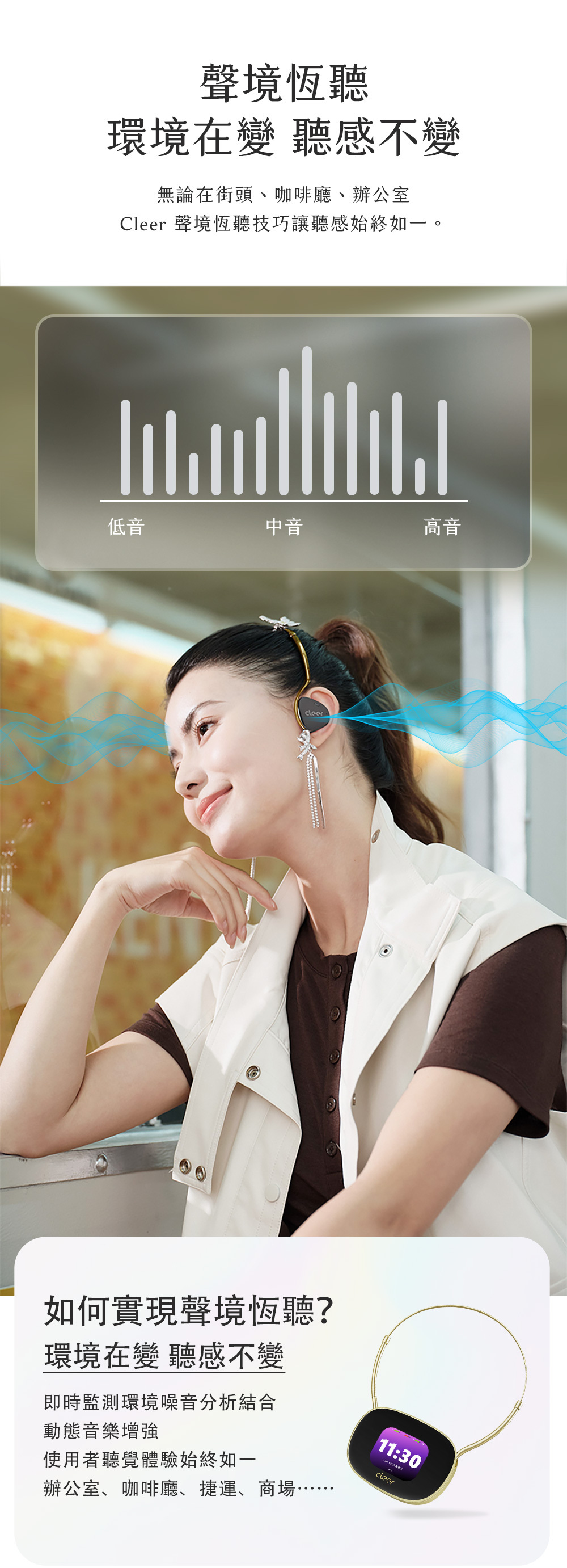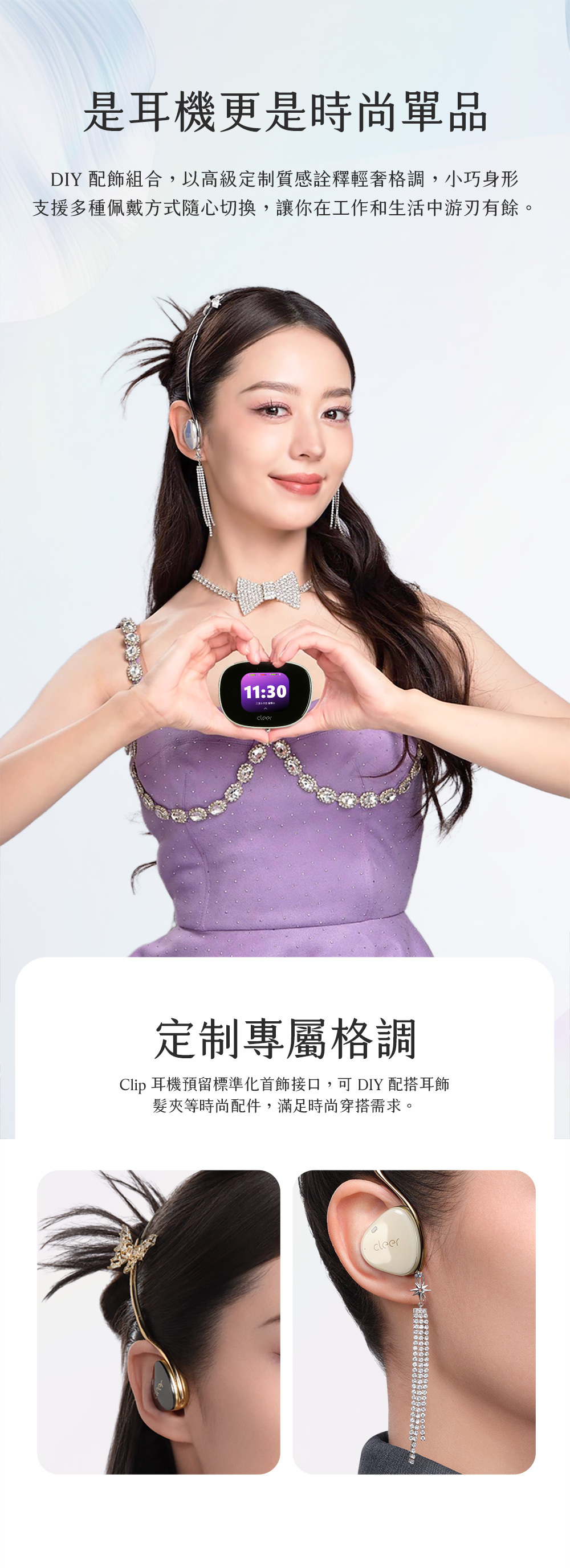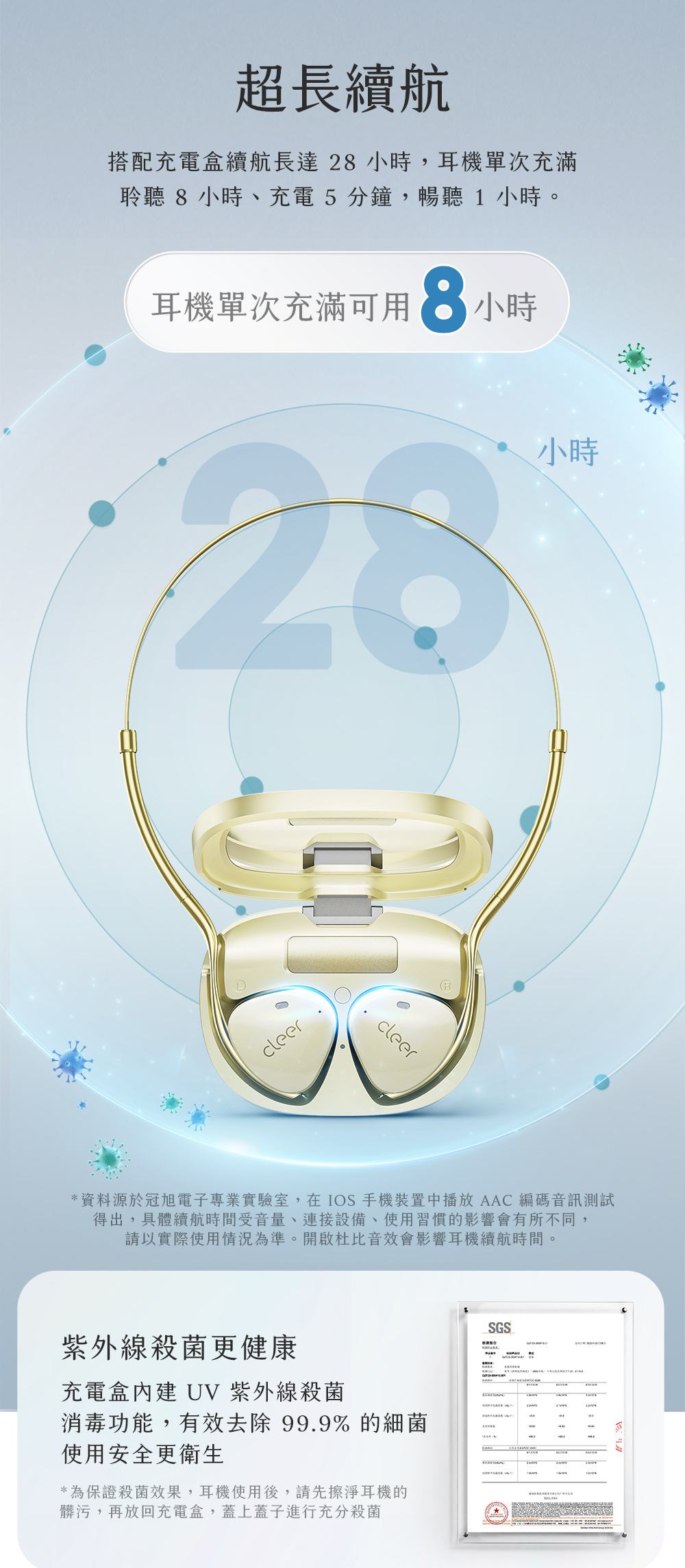 杜比全景|支持Dolby Atmos,影院級享受 專業認證|經THX認證,感受極致音效 高通晶片|高通驍龍 Snapdragon 最新音頻連線技術 震撼低音|DBE 4.0 動態低音增強功能,澎湃低音 極致音韻|通過Hi-Res Wireless音質認證 高通編碼|aptX Lossless/Adaptive 完美音質/連線/延遲 頭部追蹤|6傳感器追蹤頭部運動,360度真環繞音場 觸控螢幕|充電盒配備觸控螢幕,便於操作 殺菌消毒|充電盒內建UV紫外線消毒燈,99.9%殺菌率 附化妝鏡|充電盒內建高清化妝鏡 環境恆聽|AI恆聽讓街頭/辦公室/咖啡廳環境音感受一致 聽力保護|AI動態調整聲音大小聲,保護聽力健康 高清通話|AI場景檢測算讓戶外/騎車/高爾夫通話順暢 頂級音質|16.2mm單體,豐富細節,層次分明,震撼聽感 運動無懼|IPX7頂級防水,運動表現更升級 長效續航|28H強勁總續航 (耳機8H+充電盒20H) 衛生安全|開放設計不入耳、保護聽力,耳道衛生舒適 舒適好戴|耳掛可旋轉、伸縮、不挑耳型、配戴無感 小巧精緻|重量不到40g,厚度僅12.6mm 專屬風格|可自由搭配耳飾、髮飾,客製時尚 專屬APP|設定曲風、觸控、更新及各項智慧功能 零碳環保|通過專業認證的零碳產品,環保愛地球