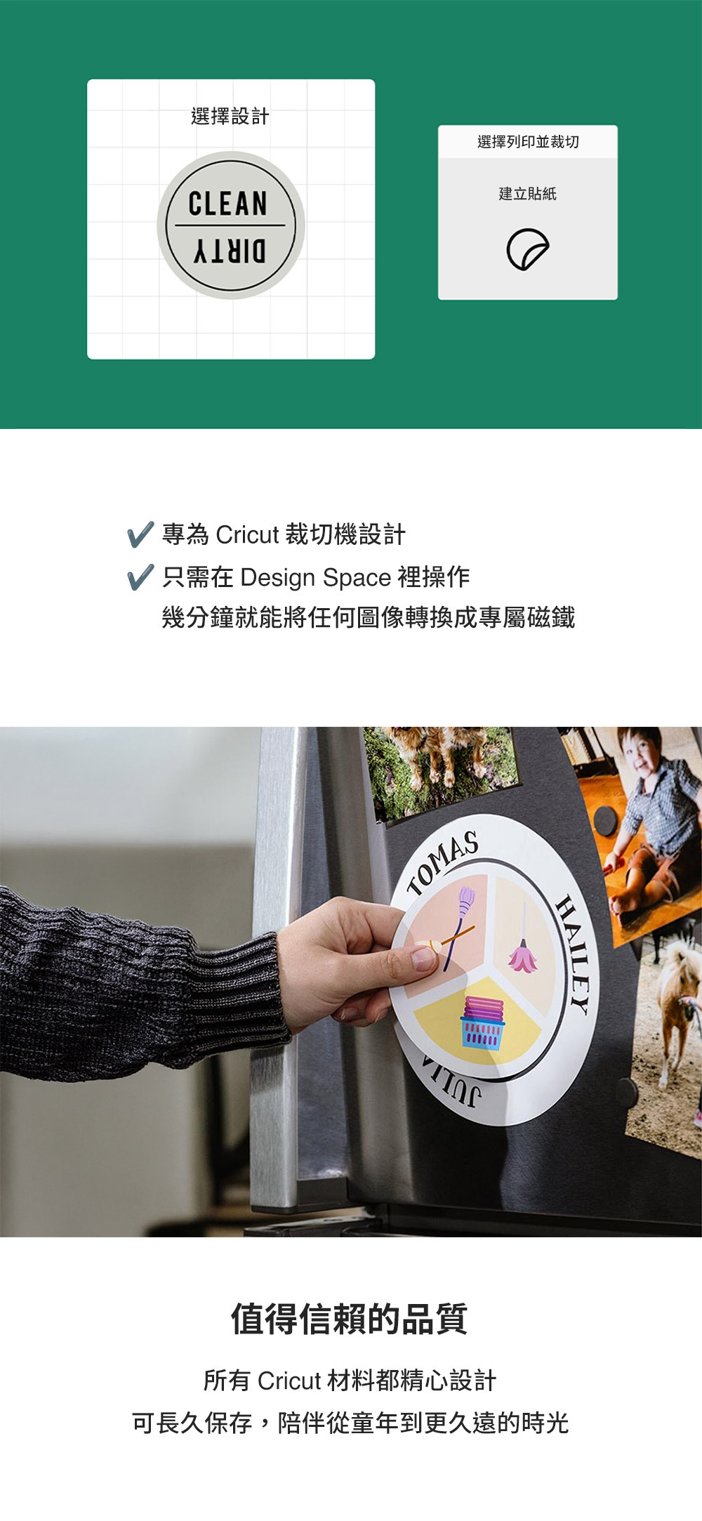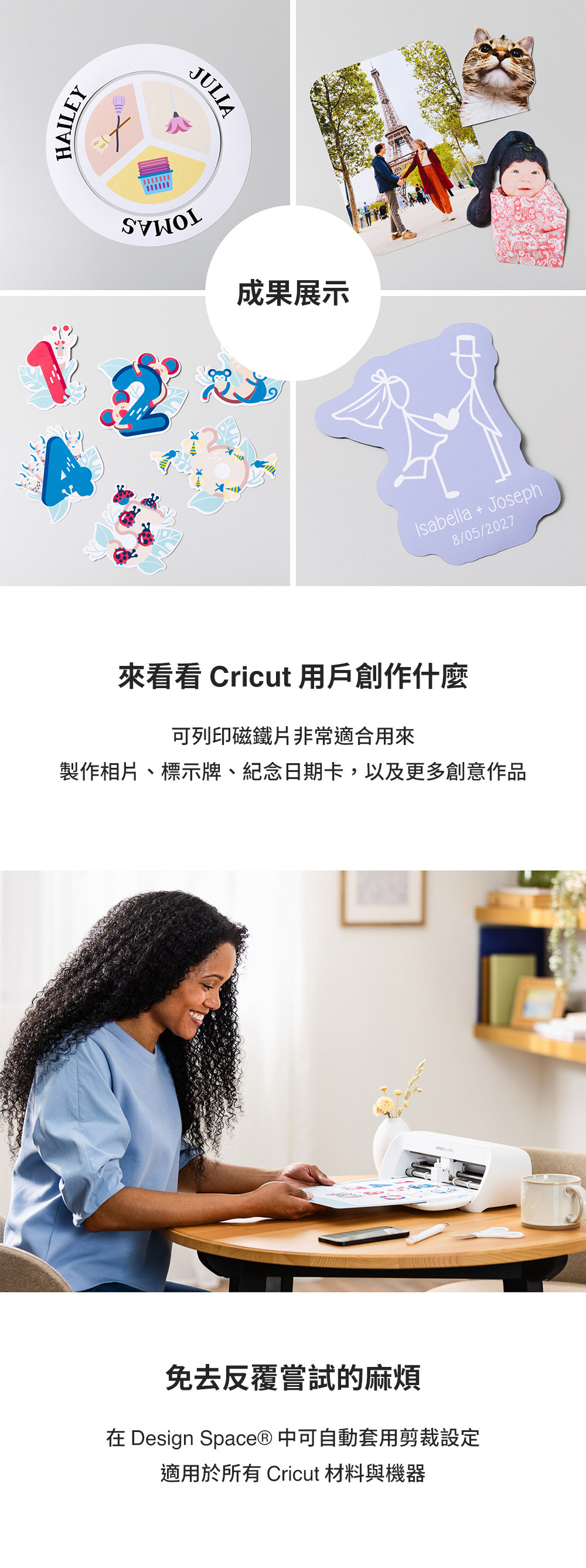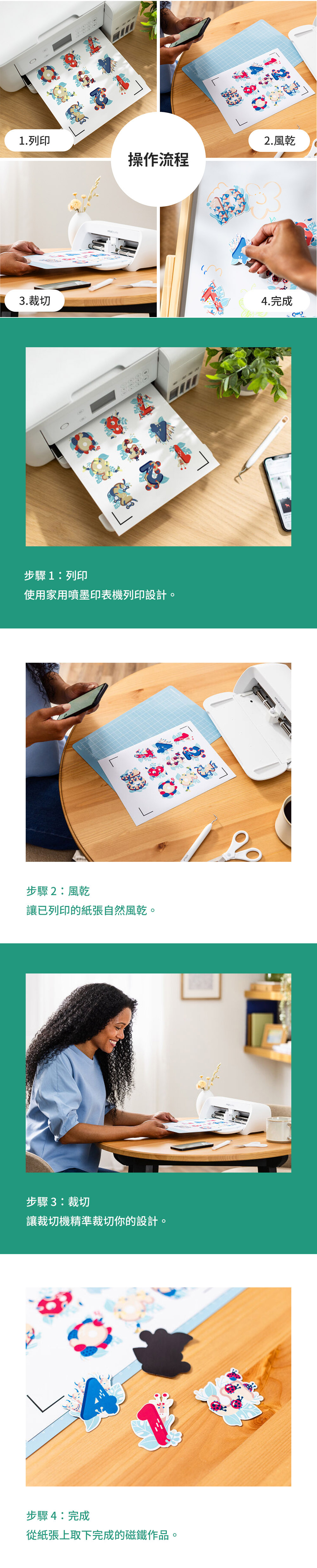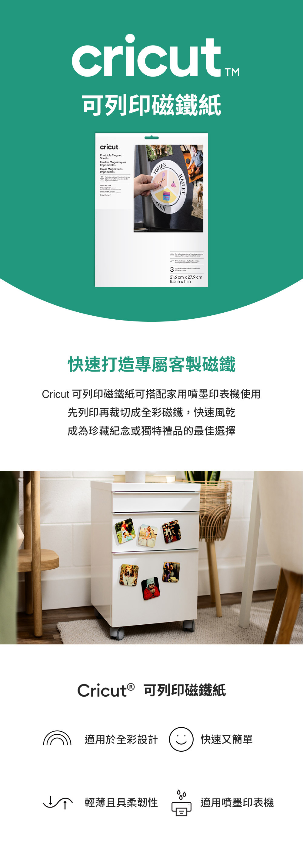 繽紛磁鐵|可列印並裁切成色彩鮮豔、持久耐用的磁鐵設計。快速上手|使用家用噴墨印表機列印,幾分鐘內即可完成裁切。輕薄柔韌|順暢列印不卡紙、不暈染,使用更安心。