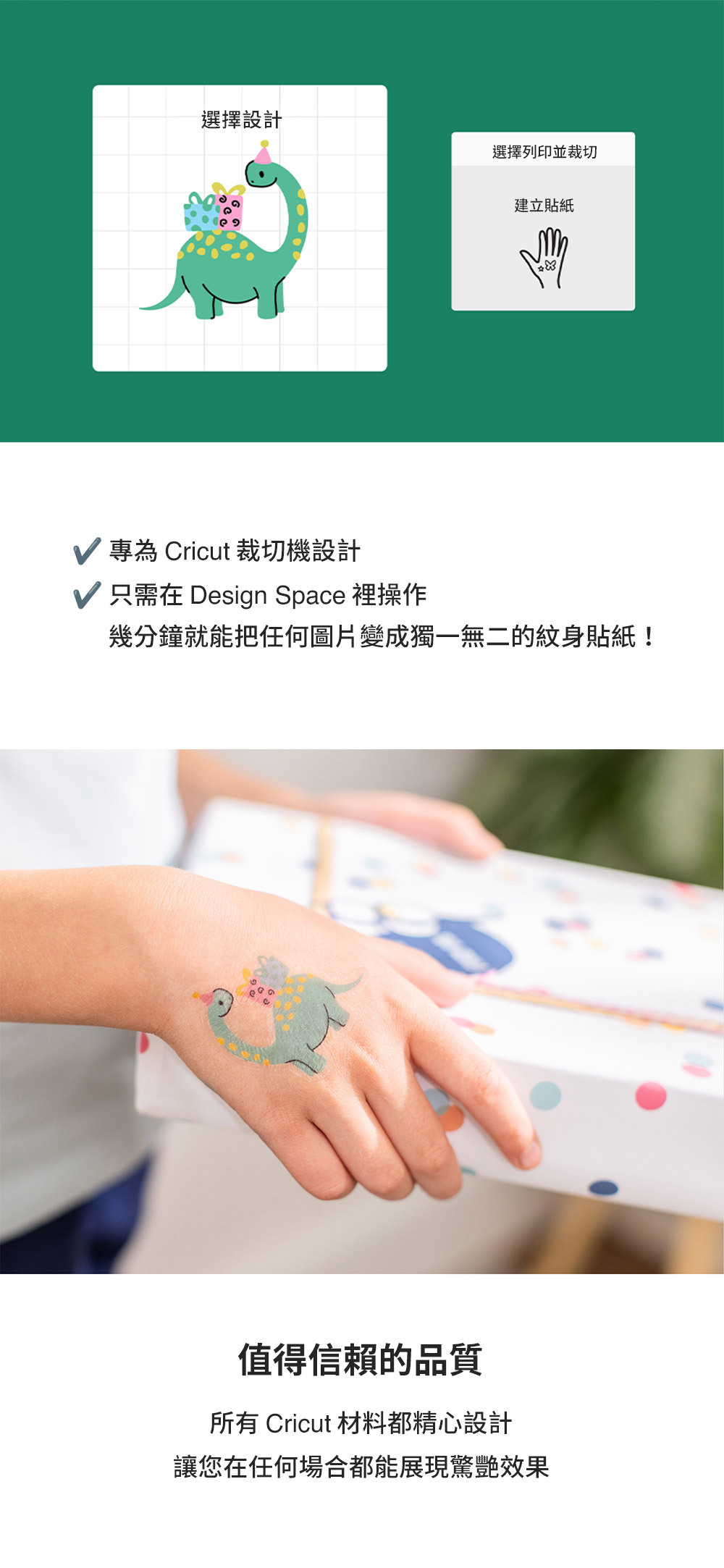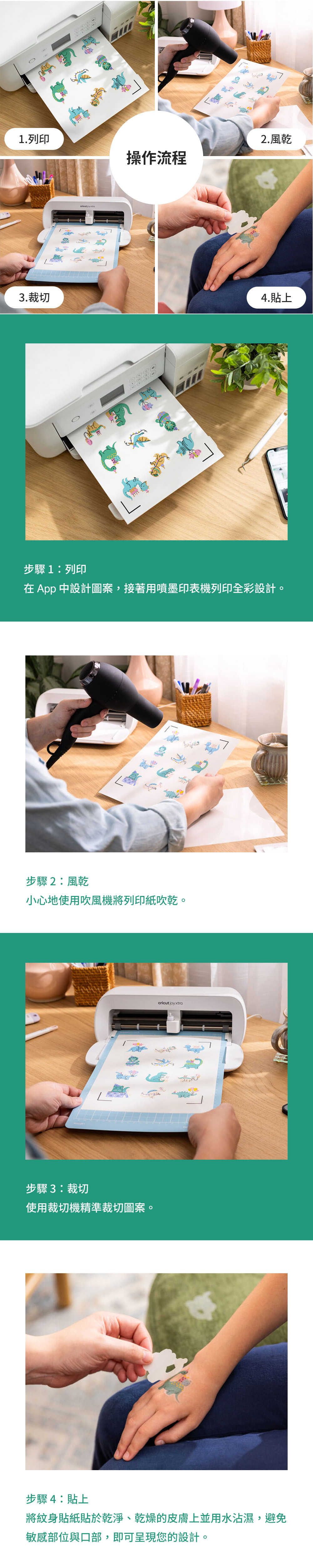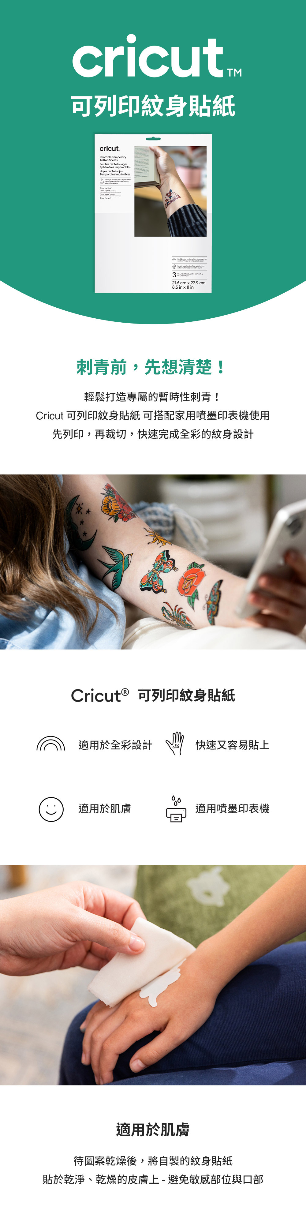 全彩紋身|可列印並裁切鮮豔生動的紋身設計。簡單快速|使用家用噴墨印表機,幾分鐘即可完成列印與裁切安心貼膚|乾燥後即可將專屬刺青貼於皮膚,僅供暫時性使用。牢固易卸|能牢牢貼合於皮膚,同時也能輕鬆移除