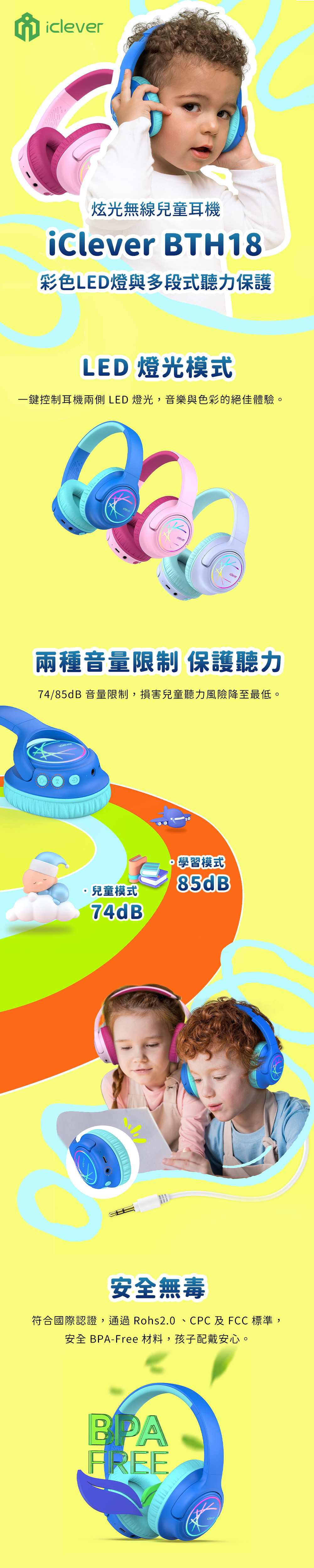 • 產品名稱:iClever BTH18 炫光無線兒童耳機