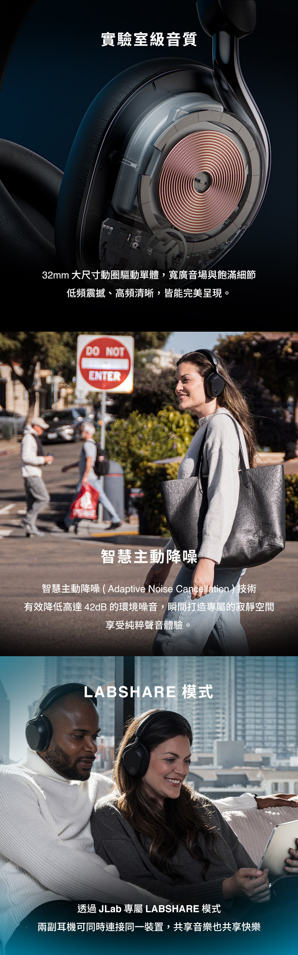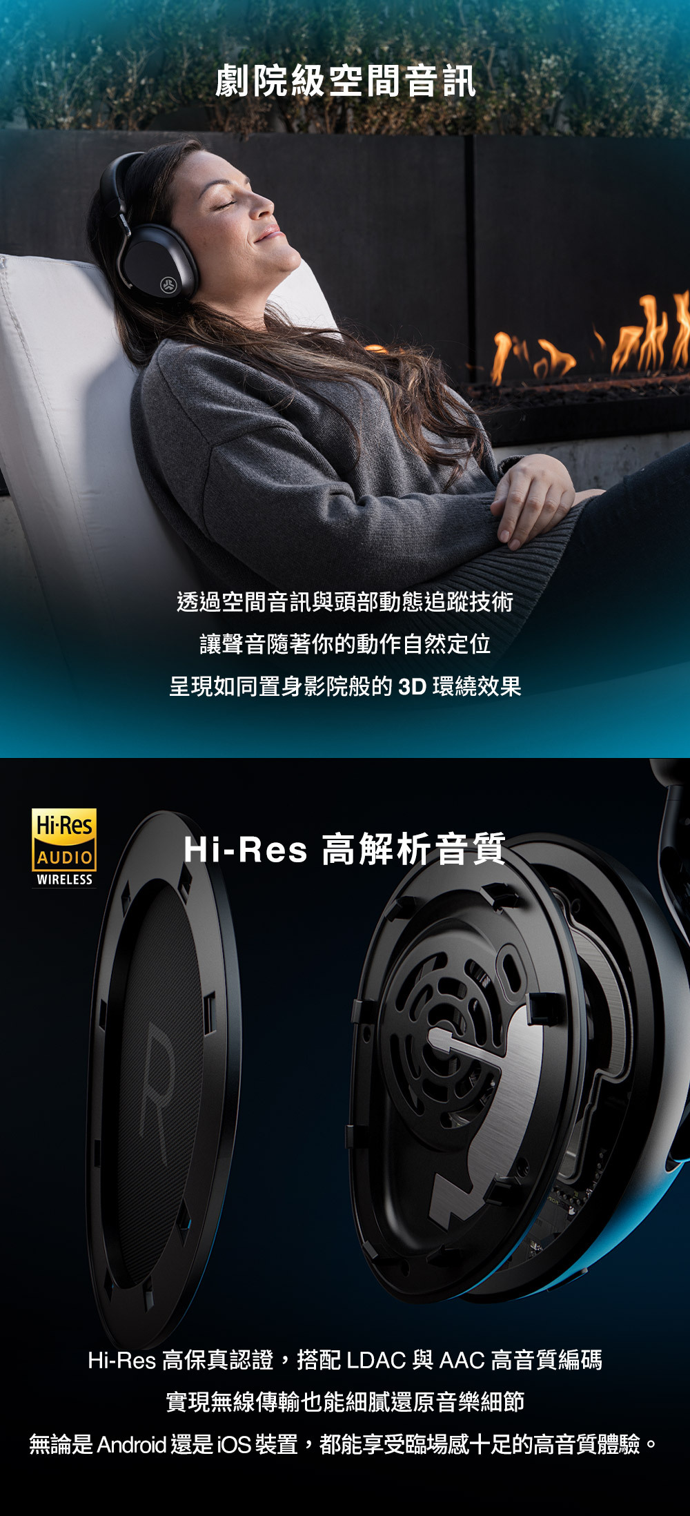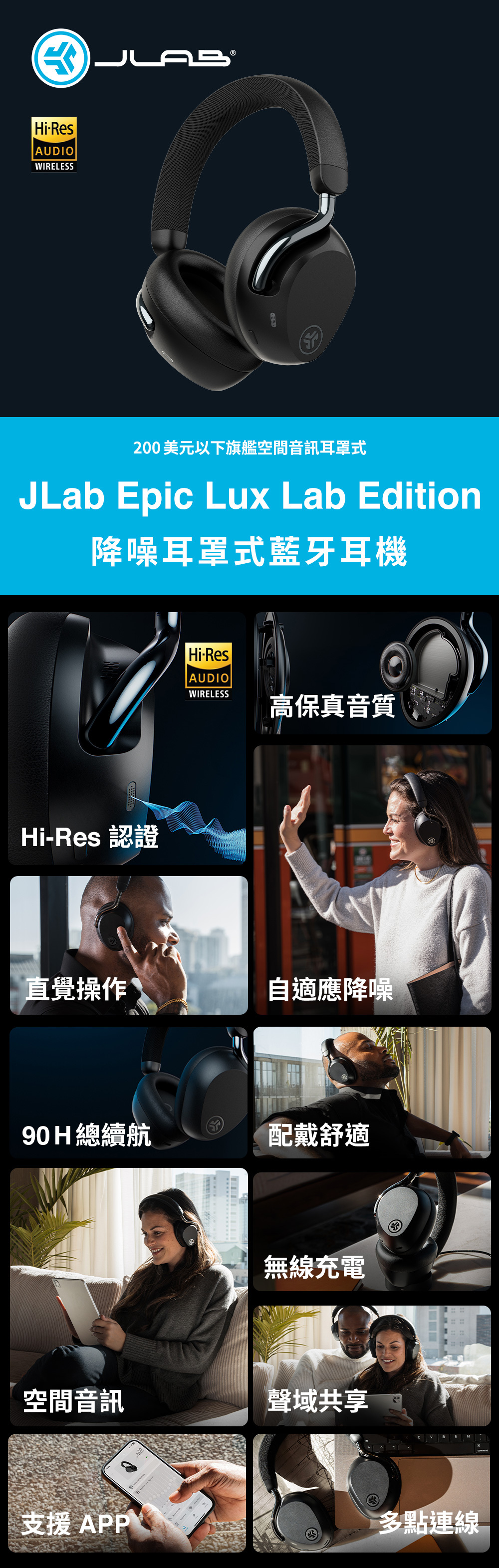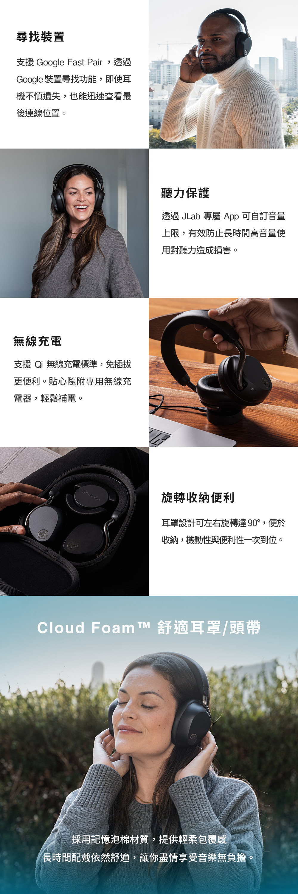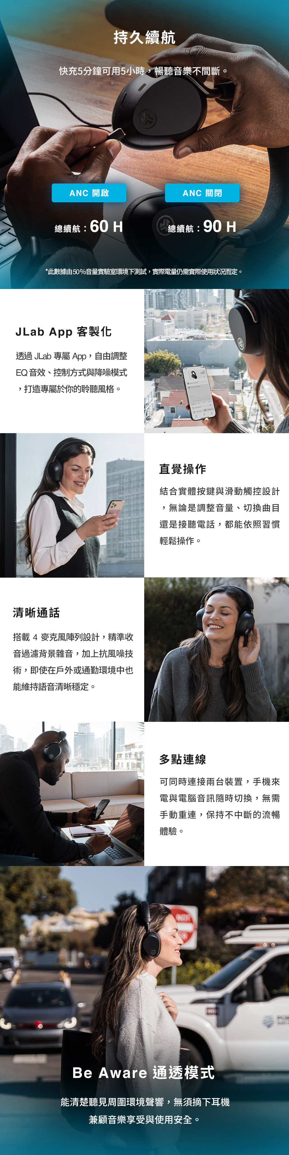 空間音頻|搭配頭部追蹤技術,劇院級體驗 音質認證| Hi-Res 高解析音質,支援LDAC/AAC 沉浸體驗|32mm 大動圈單體,實驗室級聲音 強效降噪|Adaptive 智慧降噪可降低42dB環境噪音 智慧連線|LABSHARE 模式,雙耳機共享樂趣 持久續航|長達 90H 總播放時間 (ANC關閉) 個性設定|JLab App客製化自訂聲音及體驗 雙重操控|實體按鍵與滑動觸控,直覺操作 清晰通話|4麥克風陣列並內建抗風噪技術 多點連線|支援雙裝置自由切換不斷線 通透模式|Be Aware 模式安全第一 聽力保護|APP 可調整最大音量設定 快速配對|支援Google Fast Pair(Android適用) 尋找裝置|整合尋找耳機功能,遺失也能快速定位 無線充電|支援無線充電,附專用充電板 旋轉耳罩|耳罩可旋轉90°,收納更便利 舒適配戴|耳罩與頭帶,柔軟貼合不壓耳