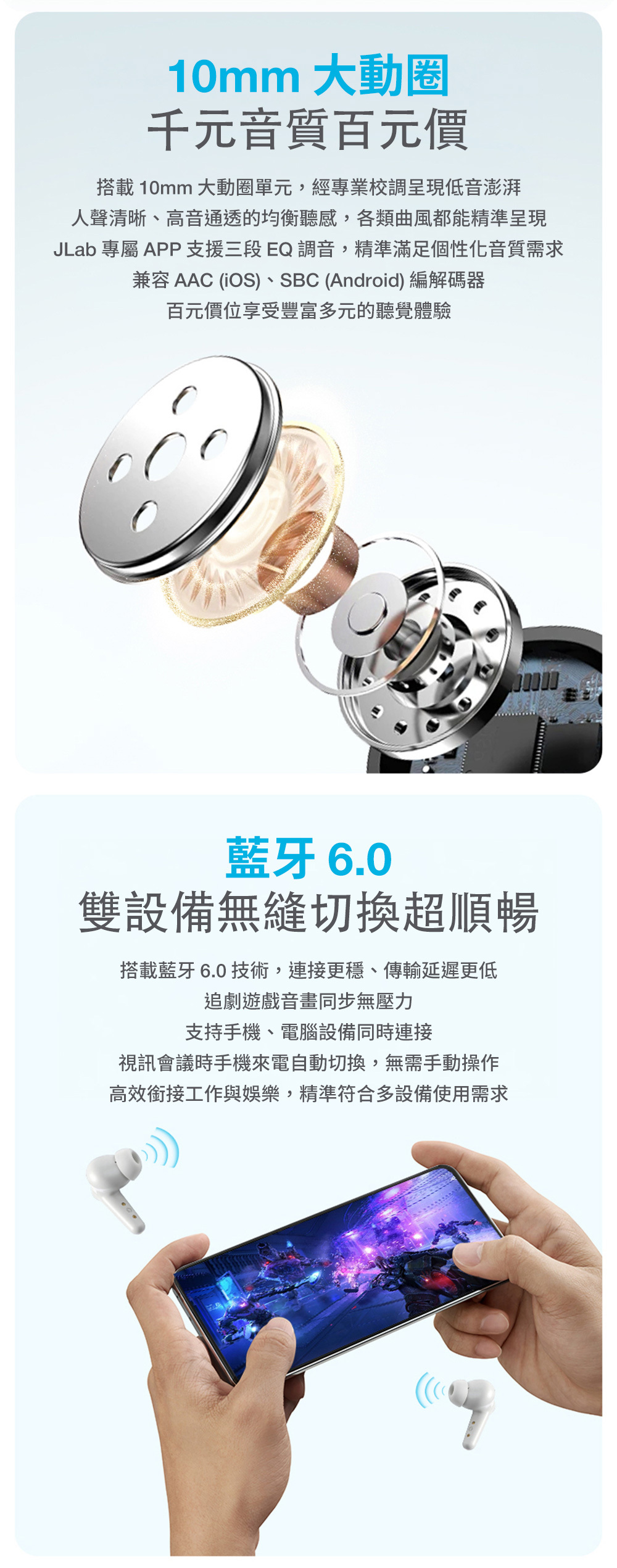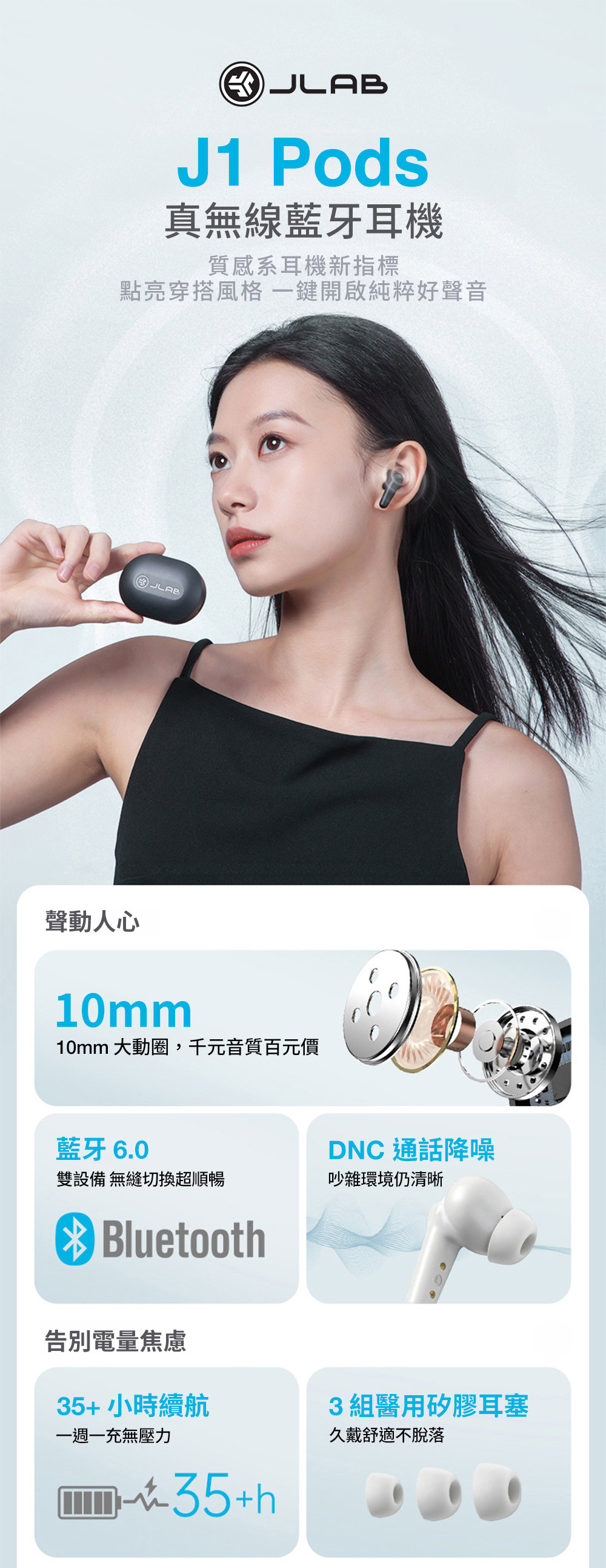 絕佳音質|10mm 大動圈,打造千元級音質 多點連線|藍牙 6.0 技術,雙設備無縫切換 清晰通話|DNC 通話降噪,吵雜環境也清晰 長效續航|35H+ 總電量,一週一充無壓力 極致舒適|醫療級矽膠耳塞,久戴穩定不脫落 通透模式|環境音模式,聽歌兼顧周遭安全 運動防水|IP55 防塵防水,運動雨天更放心 個性控制|App 自定義操作,隨心適配調整 單耳模式|雙耳獨立連線,單雙模式自由選