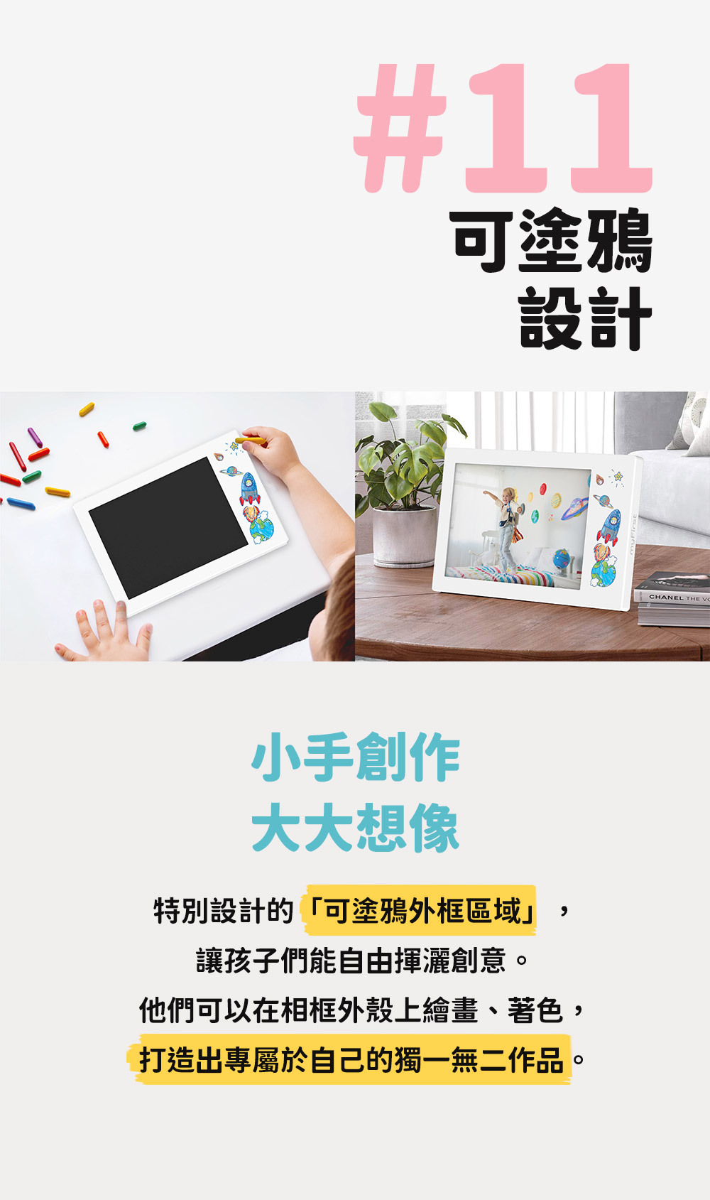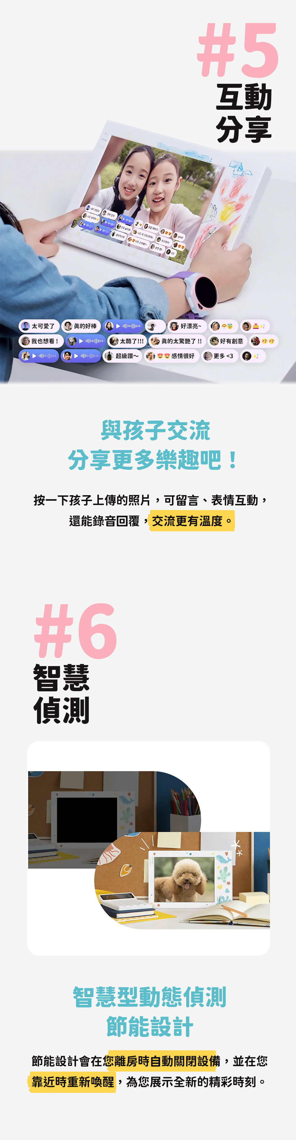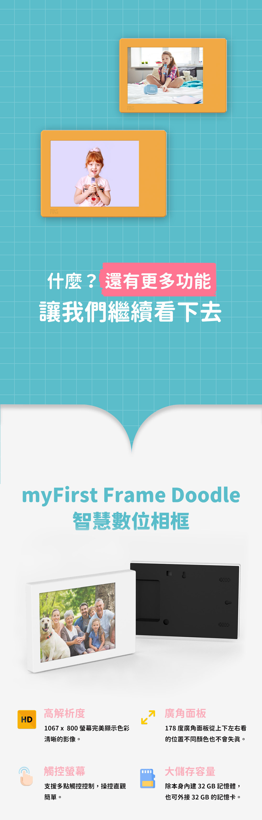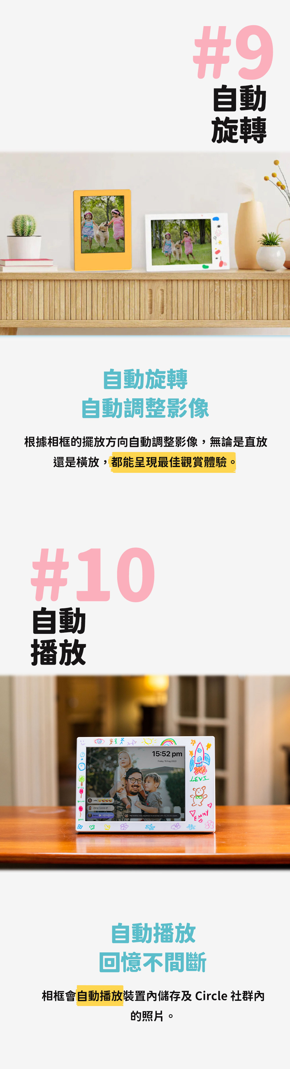 智慧相框|手機/相機Circle社群分享照片,相框立即撥放 無線共享|無線雲端分享手機/相機/手錶拍攝照片影片 互動分享|喜歡的照片可留言互動回饋照片創作者 智慧管理|輕鬆管理照片分享觀看家庭/朋友成員 智慧分享|簡單可與遠方親戚家人/朋友分享生活照片 記錄生活|Circle社群成員都是創作/互動者分享生活紀錄 暖心禮物|可塗鴉外框,孩子創作獨一無二驚喜 高解析度|螢幕完美顯示色彩清晰的影像 抗眩螢幕|減少反射並提高照片和影片的清晰度 磨砂螢幕|防指紋可確保螢幕保持乾淨清晰 廣角面板|廣角面板各角度觀看畫質清晰一致 觸控螢幕|支援多點觸控控制,操控直觀簡單 智慧偵測|運動感應器偵測無人會自動關閉 自然喚醒|日出鬧鐘模擬自然日出喚醒大腦 幫助入眠|夜間模式及搖籃曲白噪音睡眠輔助功能 自動旋轉|垂直水平擺放照片完美適應擺放方向 自動撥放|照片自動以幻燈片方式連續播放,為回憶增趣味 儲存空間|內建32G記憶體可外接記憶卡隨身碟