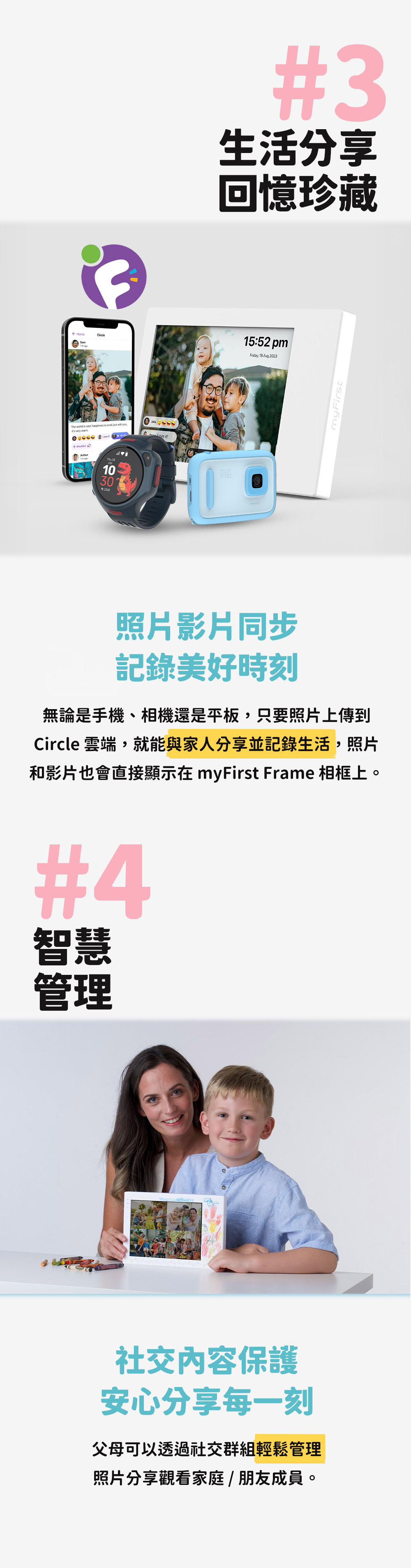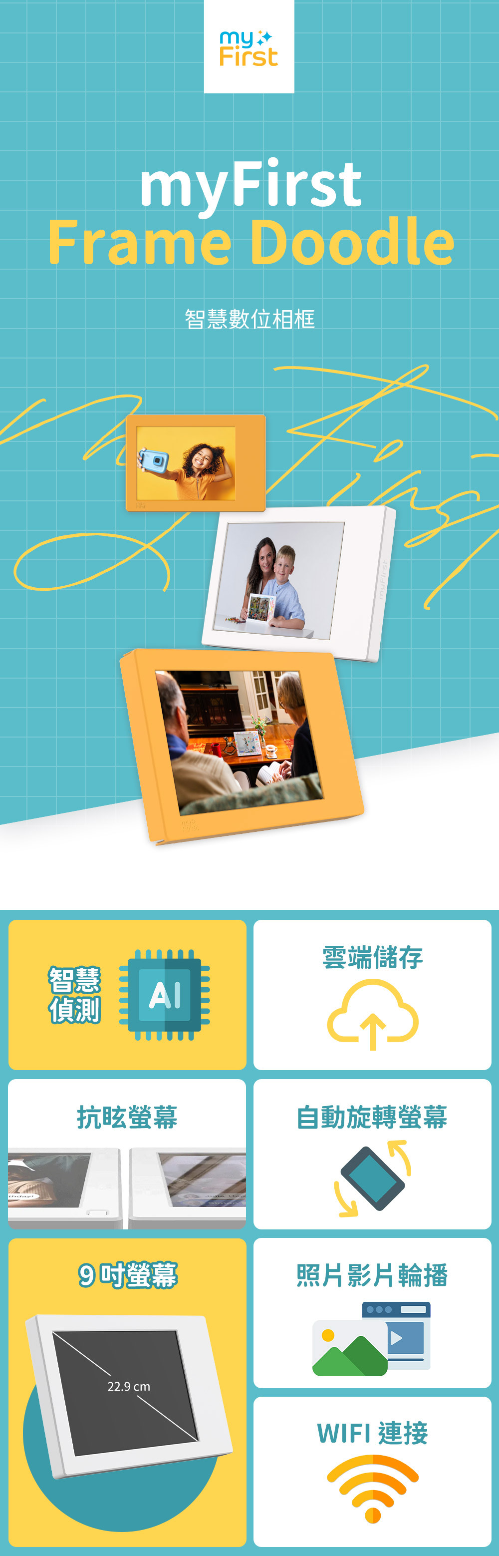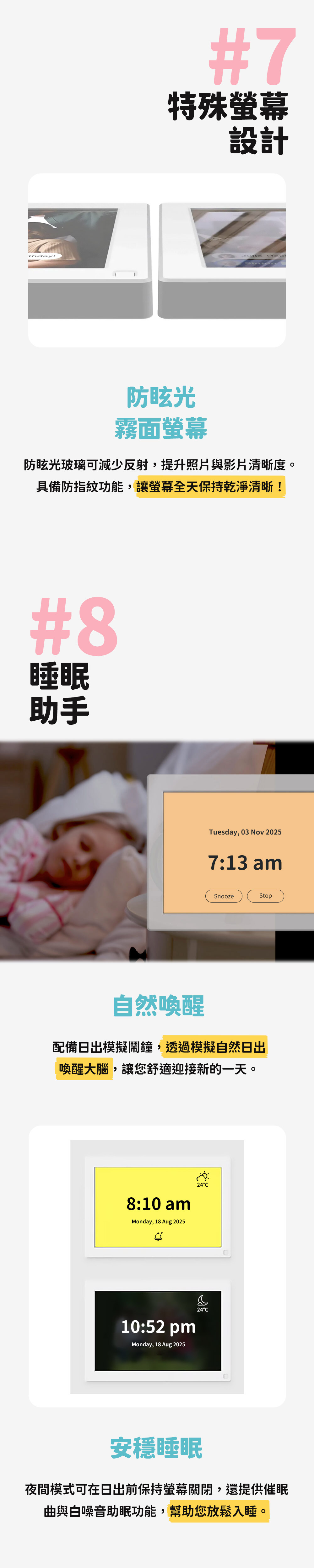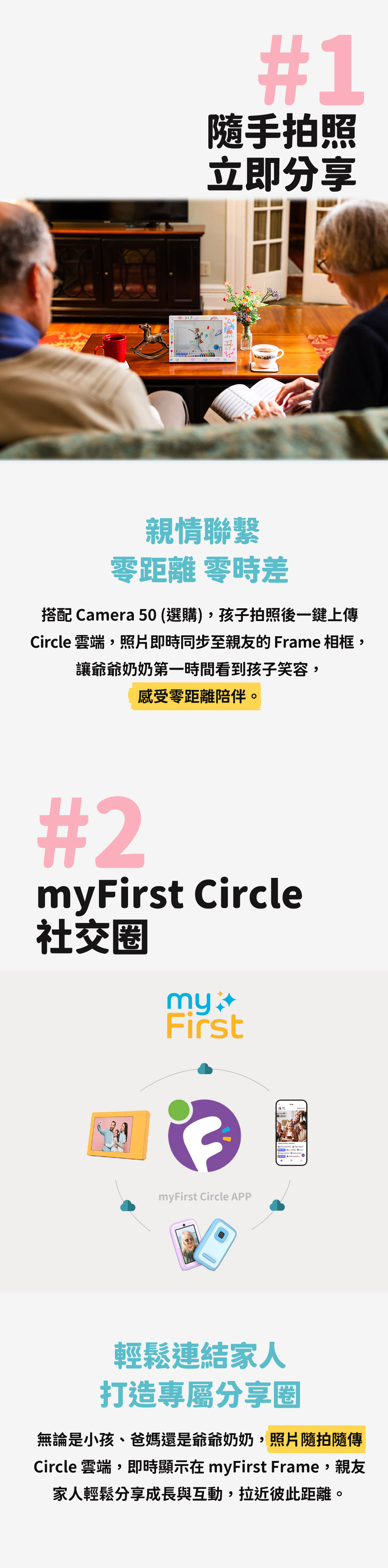 智慧相框|手機/相機Circle社群分享照片,相框立即撥放 無線共享|無線雲端分享手機/相機/手錶拍攝照片影片 互動分享|喜歡的照片可留言互動回饋照片創作者 智慧管理|輕鬆管理照片分享觀看家庭/朋友成員 智慧分享|簡單可與遠方親戚家人/朋友分享生活照片 記錄生活|Circle社群成員都是創作/互動者分享生活紀錄 暖心禮物|可塗鴉外框,孩子創作獨一無二驚喜 高解析度|螢幕完美顯示色彩清晰的影像 抗眩螢幕|減少反射並提高照片和影片的清晰度 磨砂螢幕|防指紋可確保螢幕保持乾淨清晰 廣角面板|廣角面板各角度觀看畫質清晰一致 觸控螢幕|支援多點觸控控制,操控直觀簡單 智慧偵測|運動感應器偵測無人會自動關閉 自然喚醒|日出鬧鐘模擬自然日出喚醒大腦 幫助入眠|夜間模式及搖籃曲白噪音睡眠輔助功能 自動旋轉|垂直水平擺放照片完美適應擺放方向 自動撥放|照片自動以幻燈片方式連續播放,為回憶增趣味 儲存空間|內建32G記憶體可外接記憶卡隨身碟