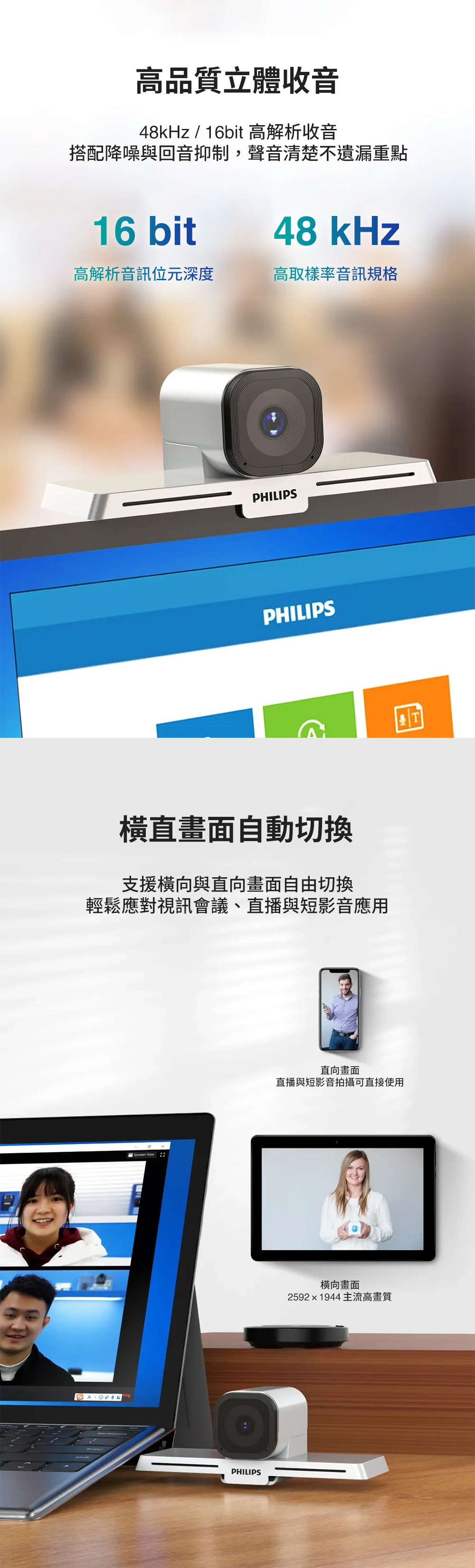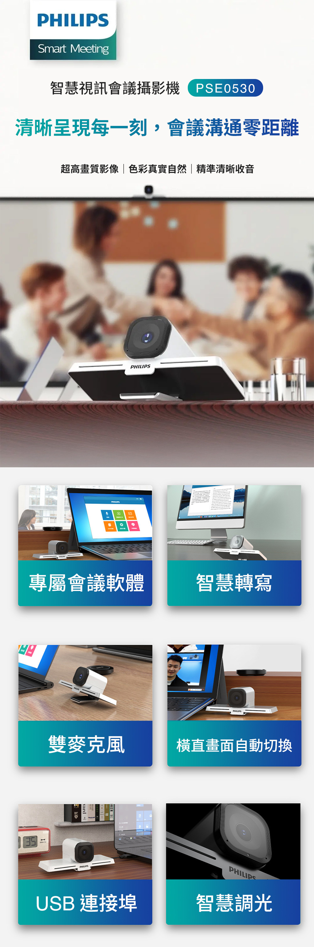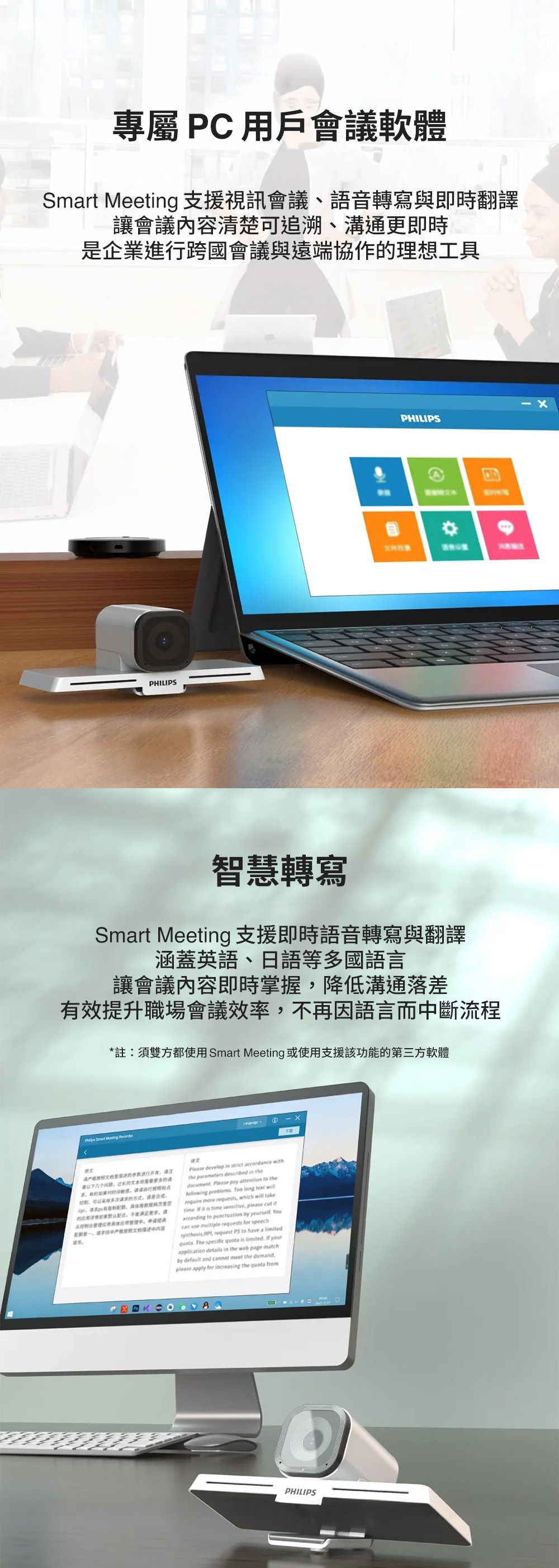 高清影像|2K 高畫質 500 萬畫素畫面細膩清晰 精準收音|雙麥克風搭載降噪抑制人聲清楚不失真 立體拾音|高解析收音規格完整捕捉每個細節 畫面切換|橫直畫面自動切換靈活應用多情境 即插即用|USB 連接免驅動快速部署各種會議空間 智慧調光|自動校正光線色彩各種環境皆自然明亮 時尚設計|外型俐落兼具專業質感桌上鏡頭款 智慧轉寫|即時語音轉文字翻譯會議紀錄更高效