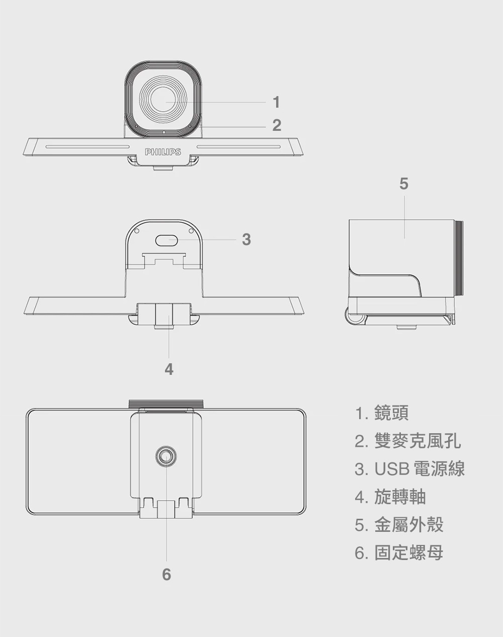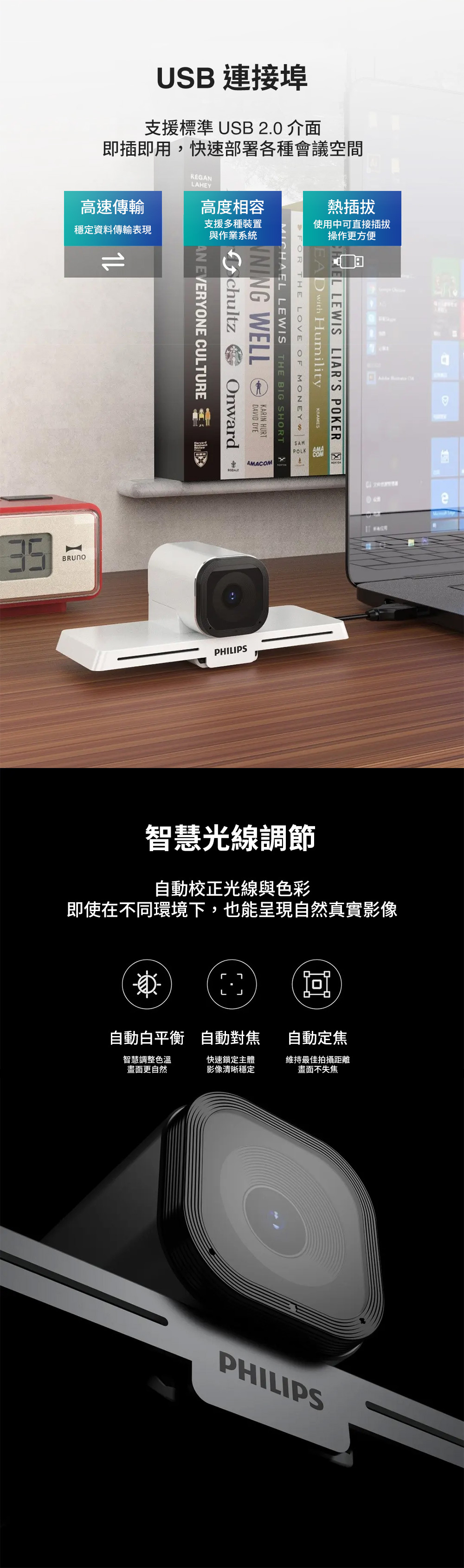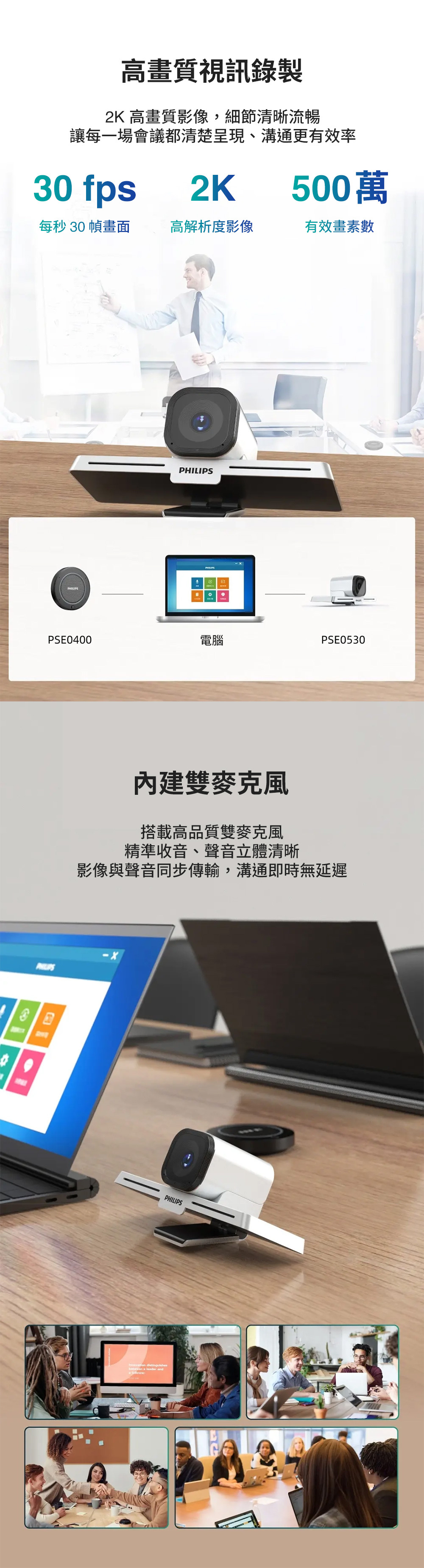 高清影像|2K 高畫質 500 萬畫素畫面細膩清晰 精準收音|雙麥克風搭載降噪抑制人聲清楚不失真 立體拾音|高解析收音規格完整捕捉每個細節 畫面切換|橫直畫面自動切換靈活應用多情境 即插即用|USB 連接免驅動快速部署各種會議空間 智慧調光|自動校正光線色彩各種環境皆自然明亮 時尚設計|外型俐落兼具專業質感桌上鏡頭款 智慧轉寫|即時語音轉文字翻譯會議紀錄更高效