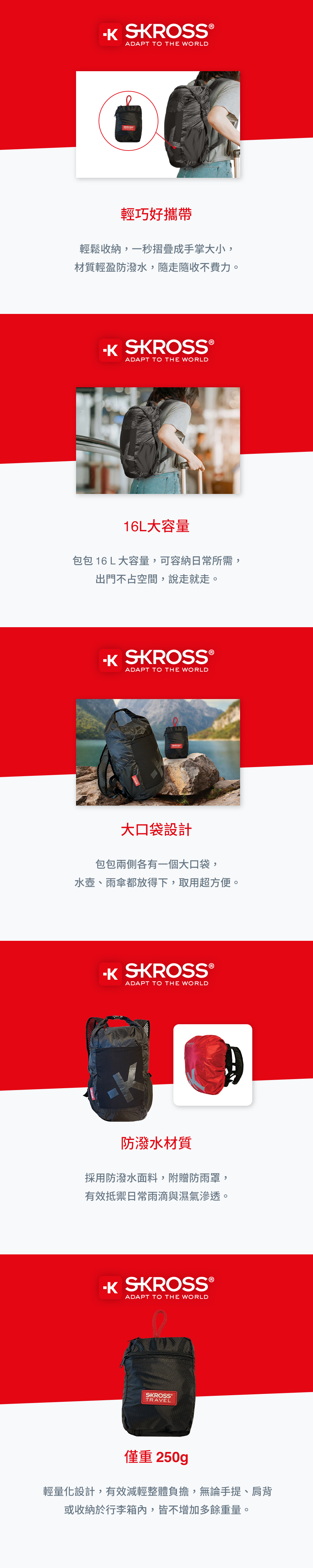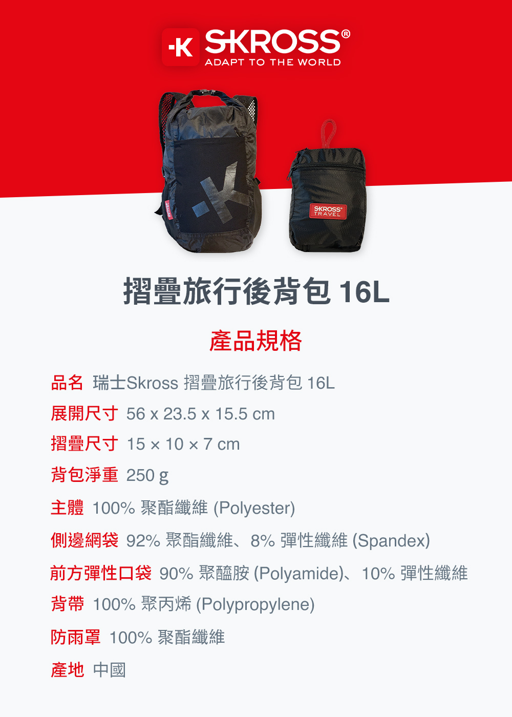 • 產品名稱:瑞士Skross 摺疊旅行後背包 16L