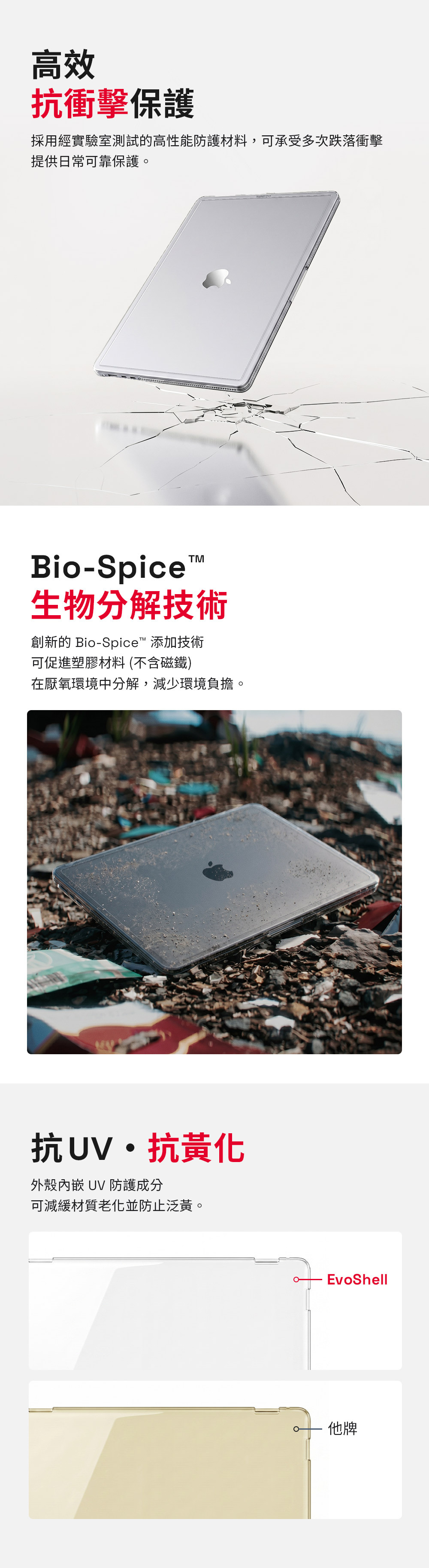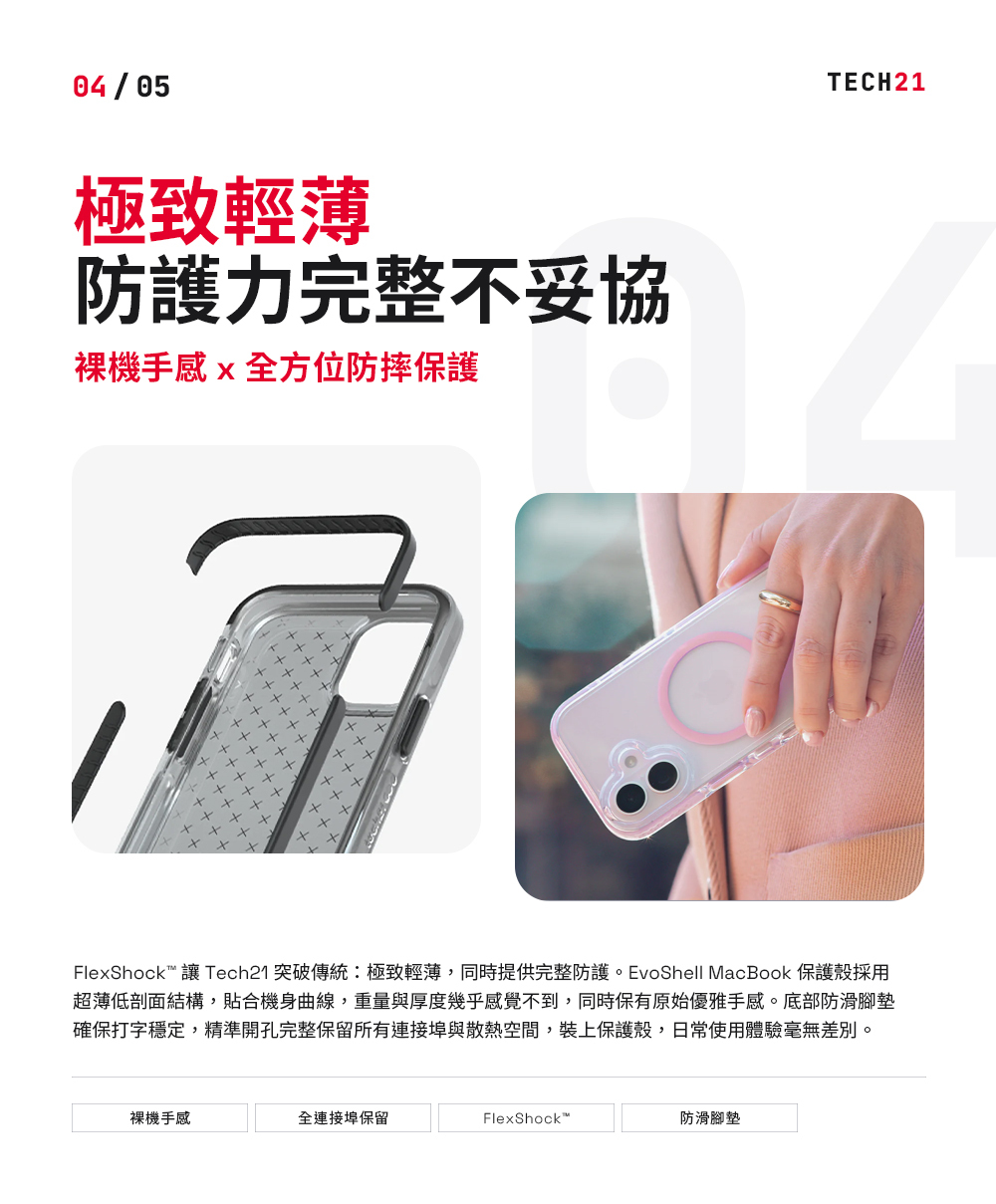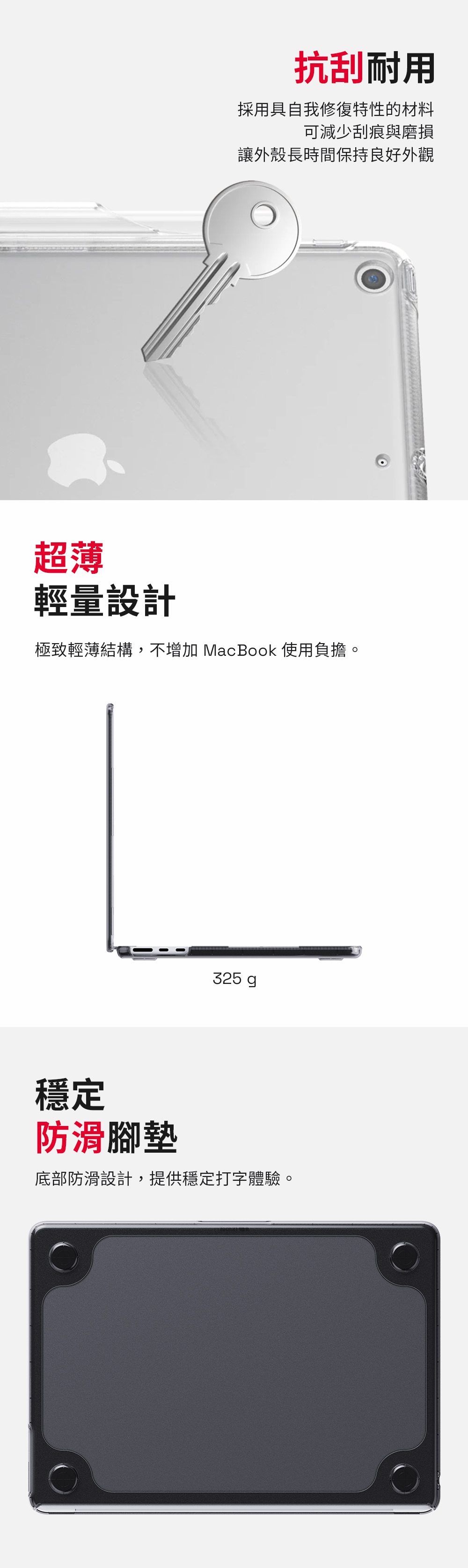 抗衝防護|高效吸震材料可承受多次跌落 抗UV防黃|減少材質老化並降低泛黃 抗刮耐磨|自我修復材質減少刮痕磨損 超薄設計|超薄外型貼合機身不厚重 穩定防滑|底部防滑設計打字更穩定 精準開孔|完整保留連接埠與散熱空間 環保包裝|採用100%再生材料包裝 永續理念|兼顧保護與環境友善