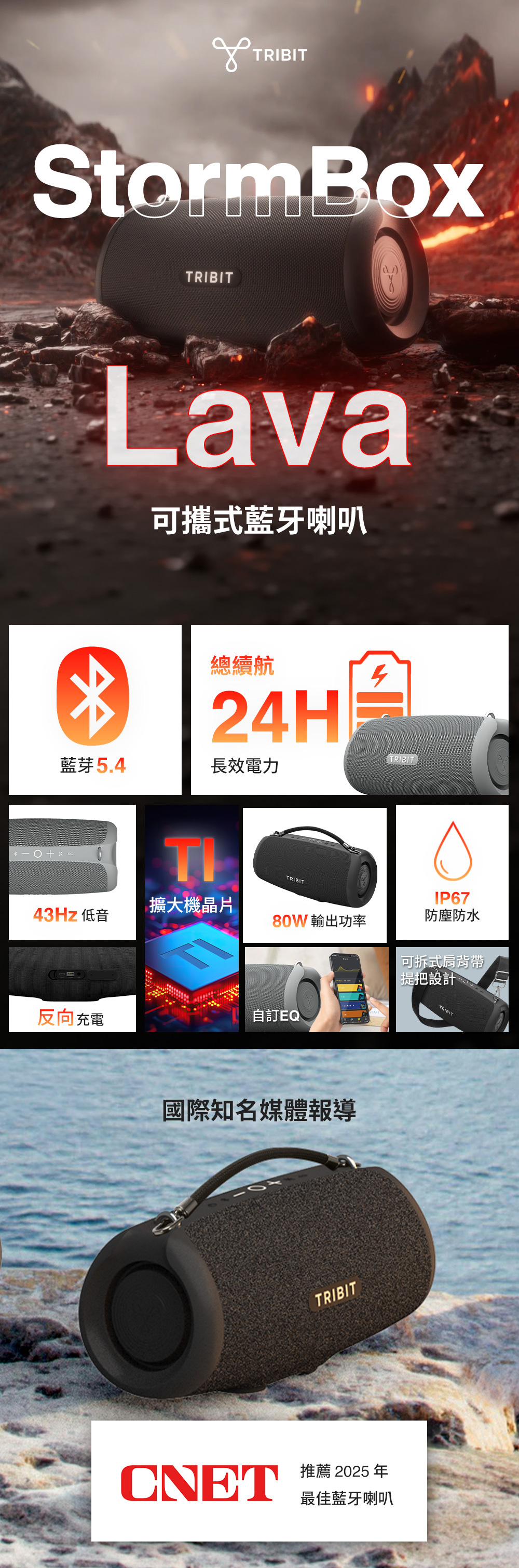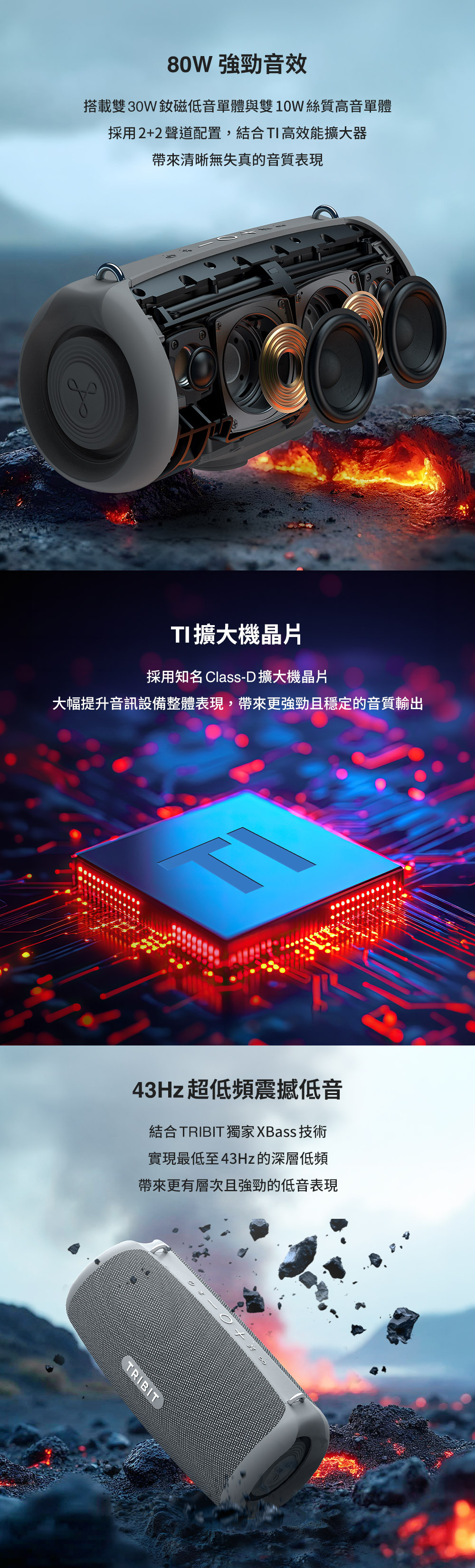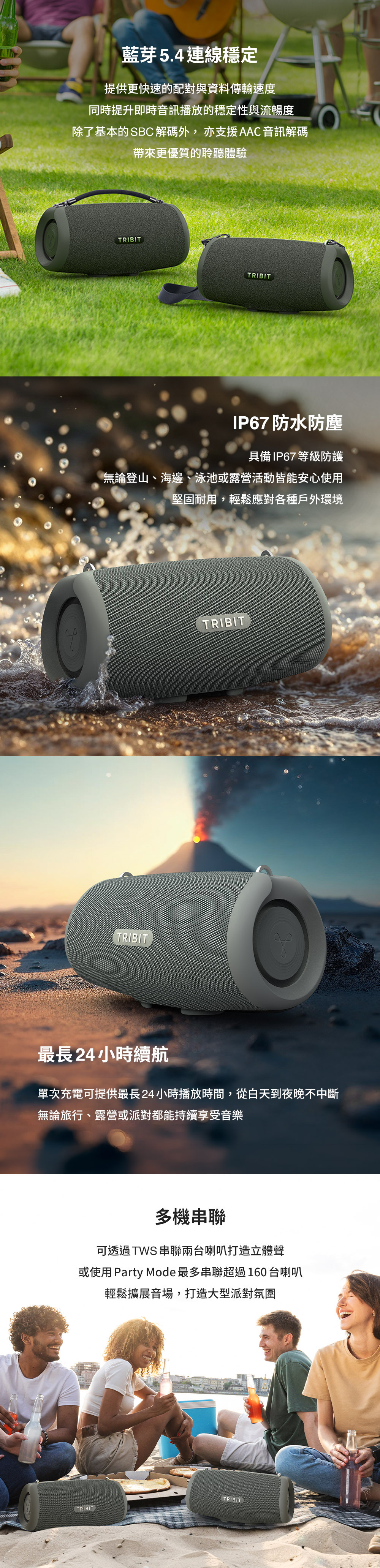 80W輸出|80W大功率震撼音效表現 深層低頻|43Hz 震撼低音,更有現場感 音效調整|EQ 模式自由切換隨心聆聽 防水防塵|IP67 防護戶外使用更安心 全天續航|最長 24小時播放不中斷 雙機串聯|TWS連線打造立體聲效果 派對擴展|支援 160台同步播放 穩定連線|藍牙 5.4 傳輸快速穩定 高效擴大|結合 TI 擴大技術,輸出更穩定 靈活攜帶|雙背帶設計外出更便利